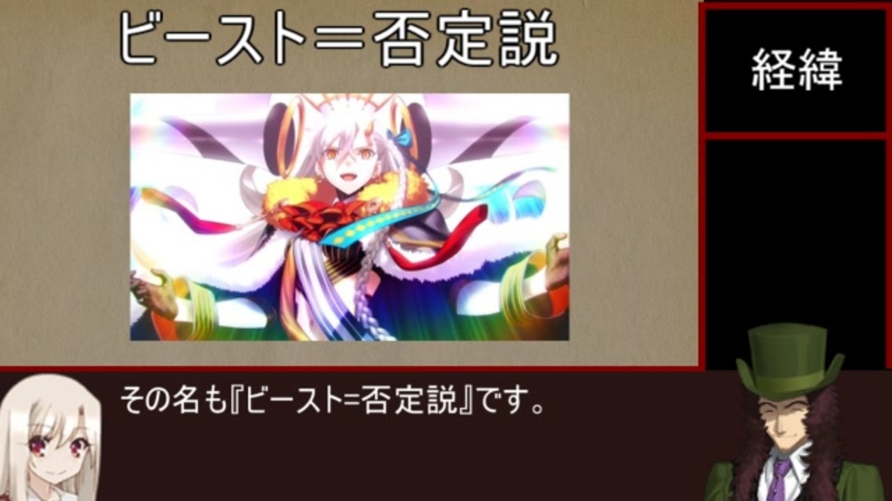 「ビースト」の考察です<br>人類愛がビーストにあるかないかを考察してます<br><br>いいねに、好きなビーストを書いてます。<br>お二方の動画面白いのでぜひ見てください。<br><br>茶番飛ばしたい人用<a href="#" class="seekTime" data-seekTime="03:00" onclick="seekNicoPlayer('#03:00'); return false;">#03:00</a><br>ネガスキル考察から見たい人用<a href="#" class="seekTime" data-seekTime="11:10" onclick="seekNicoPlayer('#11:10'); return false;">#11:10</a><br>否定説から見たい人用<a href="#" class="seekTime" data-seekTime="15:43" onclick="seekNicoPlayer('#15:43'); return false;">#15:43</a><br>キリスト説から見たい人用<a href="#" class="seekTime" data-seekTime="24:15" onclick="seekNicoPlayer('#24:15'); return false;">#24:15</a><br>偽きのこさんの動画「<FGO考察>人類悪「選定」説」(<a href="https://www.nicovideo.jp/watch/sm39184652" class="watch">sm39184652</a>)<br>山羊ラビットさんの動画「《ビースト考察・内》 人類悪と人類愛」(<a href="https://www.nicovideo.jp/watch/sm38345410" class="watch">sm38345410</a>)<br><br><br>路地裏考察マイリスト→<a href="https://www.nicovideo.jp/mylist/71060497" target="_blank" rel="noopener">mylist/71060497</a><br>FGO考察マイリスト→<a href="https://www.nicovideo.jp/mylist/70012622" target="_blank" rel="noopener">mylist/70012622</a><br>次動画→<a href="https://www.nicovideo.jp/watch/sm39525880" class="watch">sm39525880</a>(アニムスフィアの秘奥義)<br>前動画→<a href="https://www.nicovideo.jp/watch/sm39196765" class="watch">sm39196765</a>(モールス信号)<br>