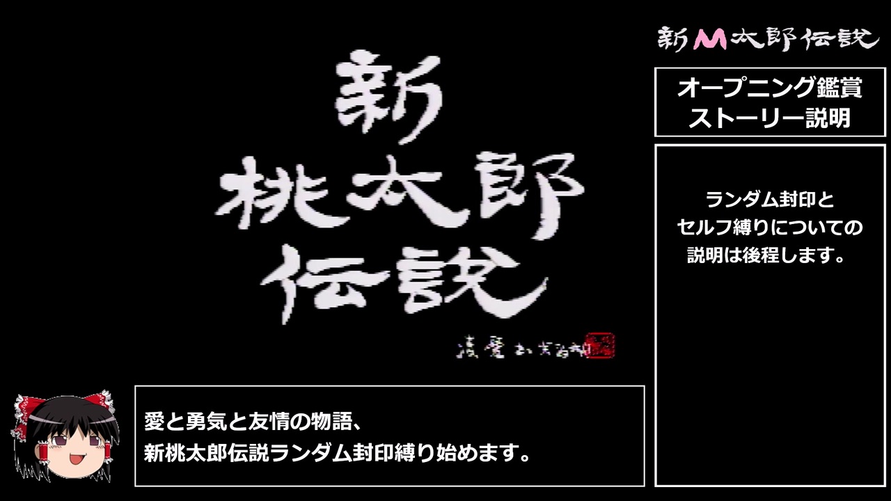 新桃太郎伝説ランダム封印縛りPart1です。<br><br>Part0にて多くのコメント、いいね!ありがとうございます。<br>動画作成初心者ですが、皆様のアドバイスがあれば安泰じゃ。<br><br>・ランダム封印縛りについて<br> 1段上昇につき武器・防具・道具・術・命令・一部戦闘コマンドからランダムで1封印。<br><br>・ランダム封印のほかに7つのセルフ縛りを設定。<br><br>・新M太郎伝説セルフ縛り7か条<br> 第一条 - 「えんま様・ましら・はらだしは使用禁止とする。」<br> 第二条 - 「宿に泊まってはならない。」<br> 第三条 - 「真の仲間以外であれば、間引くことができる。」<br> 第四条 - 「バグ技・裏技は使用禁止を守りぬかなくてはならない。」<br> 第五条 - 「過度なドーピングは禁止が原則である。」<br> 第六条 - 「戦闘バランスを崩壊させる道具である崑崙の玉・根性の玉・強力丹は1戦闘につき1人1個ずつしか使用してはならない。」<br> 第七条 - 「夜叉姫が真のヒロインだ!」<br> 第一条補足 - 「詰んだと判断された場合チートキャラの使用は認められる。」<br> 第七条補足 - 「夜叉姫の術と武器防具がすべて封印されてもパーティーから外れることは無い。」<br><br>リスペクト元→<a href="https://www.nicovideo.jp/watch/sm37350612" class="watch">sm37350612</a><br>封印シート作成参考→<a href="https://www.nicovideo.jp/watch/sm38396990" class="watch">sm38396990</a><br>biim兄貴桃伝1RTA→<a href="https://www.nicovideo.jp/watch/sm19683702" class="watch">sm19683702</a><br>