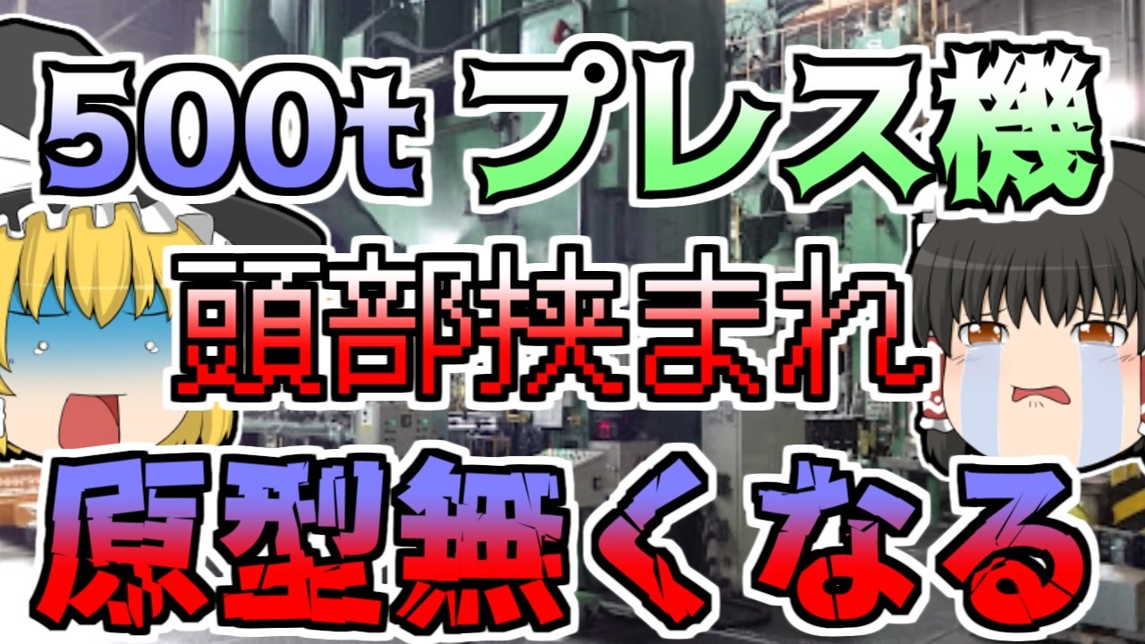 #ゆっくり解説 #ゆっくりするところ #板金<br><br>今回紹介するのは、リクエストがあった『プレス機頭部破壊』です。<br>兵庫県某所には、板金塗装などを行っている工場がありました。<br>この工場では、自動車の板金塗装などをメインとしていましたが、<br>自動車パーツの製造なども行っていました。<br>この日、乗用車用の金属部品の発注を受けていたこの工場では、プレス機を使い、金属の圧延を行っていました。<br>この作業を行っていたAさんでしたが、プレス機が途中で停止してしまったため、プレス機と材料の金属の間に体を入れ、様子をみましたが・・・・<br><br><br><br>引用:出典:参考<br>Wikipedia<br>ishort.ink/FWnv<br>マシンライフ<br>ishort.ink/WNcs<br>東信工㈱<br>ishort.ink/cQMn<br>㈱ヤマモト自動車工業<br>ishort.ink/NxQx<br><br />※この動画は過去の事件を知り、現在でも同じことが発生する危険性を再認識、関与しないように促すための動画であり、視聴者を扇動、動揺を誘うためのコンテンツではありません。<br><br>ご要望にお応えして、メンバーシップの開設を行いました。<br>下記URLからも登録可能ですので、ご興味がある方は是非ご参加ください。<br><a href="https://www.youtube.com/channel/UCcT5a1J7XJW7CLYI2RKl4pw/join" target="_blank" rel="noopener nofollow">https://www.youtube.com/channel/UCcT5a1J7XJW7CLYI2RKl4pw/join</a><br><br><br>Twitter<br>→<a href="https://twitter.com/yukkurisurutoko" target="_blank" rel="noopener nofollow">https://twitter.com/yukkurisurutoko</a><br><br>取り急ぎ、簡易的にですがマイリストを作りました。<br>【ゆっくり解説】事故・事件関係紹介リスト <br><a href="https://www.nicovideo.jp/mylist/71034319" target="_blank" rel="noopener nofollow">https://www.nicovideo.jp/mylist/71034319</a><br>【ゆっくり解説】放射線系事故<br><a href="https://www.nicovideo.jp/mylist/71034368" target="_blank" rel="noopener nofollow">https://www.nicovideo.jp/mylist/71034368</a><br>【ゆっくり解説】鉄道系事故・事件関連<br><a href="https://www.nicovideo.jp/mylist/71034379" target="_blank" rel="noopener nofollow">https://www.nicovideo.jp/mylist/71034379</a>