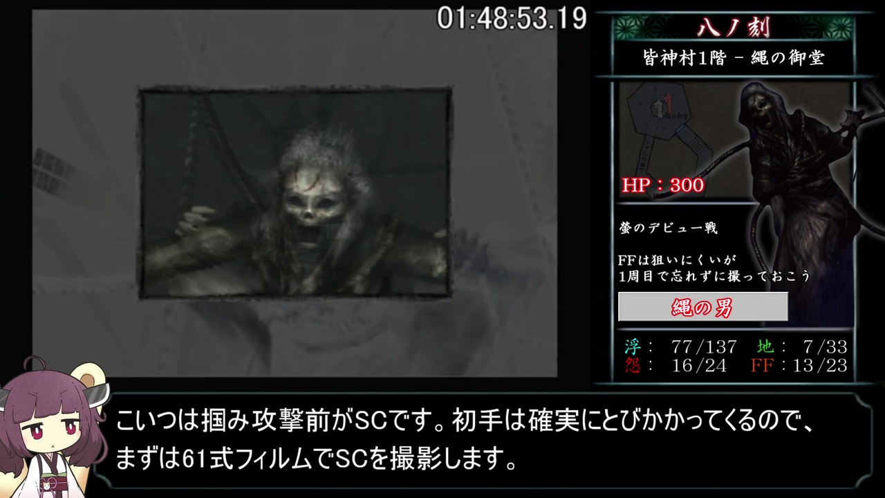 <span style="color: #ff0000;"><strong>~追記~<br>この先腐るほど時間はあるので、<br>もし零関連で、RTA関連でもそれ以外でも質問があればお気軽にコメントドゾー<br>(※月蝕と濡鴉は1回やったくらいなのでよくわかりません(屑))</strong></span><br><br>毎週金曜日投稿の誓いを破りました。<br>すいません許してください!きりたんが何でもしますから!<br><br>あっそうだ(唐突)、<br>刺青の聲タグアドバイス兄貴ありがとナス!タグ付け替えました。<br><br>七ノ刻開始~八ノ刻終了まで<br><br><a href="https://www.nicovideo.jp/watch/sm39379666" class="watch">sm39379666</a>←前|<a href="https://www.nicovideo.jp/mylist/71775161" target="_blank" rel="noopener">mylist/71775161</a>|次→<a href="https://www.nicovideo.jp/watch/sm39482043" class="watch">sm39482043</a><br><br>RTA part1集 <a href="https://www.nicovideo.jp/mylist/71936684" target="_blank" rel="noopener">mylist/71936684</a><br><br><strong><u>▼参考サイト様等</u></strong><br>・攻略フルーツ - 零 刺青の聲 - <a href="https://xn--cool-kk4csd1lrc8dvi.xyz/zero-koe/" target="_blank" rel="noopener nofollow">https://xn--cool-kk4csd1lrc8dvi.xyz/zero-koe/</a><br>・零~刺青ノ聲~ 公式完全攻略本 導魂之書 - 株式会社エンターブレイン<br><br><strong><u>▼お借りした素材達</u></strong><br>・【akihiyo様】:立ち東北きりたん素材 - <a href="https://seiga.nicovideo.jp/seiga/im10601764" target="_blank" rel="noopener">im10601764</a><br>・【公式様】:東北ずん子のイラスト/3Dデータ - <a href="https://zunko.jp/con_illust.html" target="_blank" rel="noopener nofollow">https://zunko.jp/con_illust.html</a><br>・【hiropon様】:指さし棒 - <a href="https://commons.nicovideo.jp/works/nc190353" target="_blank" rel="noopener">nc190353</a><br>・【日真ってる仁様】:真顔のあかりちゃん - <a href="https://seiga.nicovideo.jp/seiga/im9387108" target="_blank" rel="noopener">im9387108</a><br><br><strong><u>▼プレイ環境</u></strong><br>・本体(実機):SCPH-30000<br>・コントローラ:SCPH-10010<br>・ディスク:廉価版のやつ<br><br><strong><u>▼レギュレーション/縛り等</u></strong><br>・計測開始:1周目開始時New GameからNormalを選択した瞬間<br>・計測終了:2周目終了時リザルト画面にて「霊リスト:217/217」が表示された瞬間<br>・難易度は2周ともNormal<br>・エンディングは2周ともノーマルエンド<br>・バグ技はなんでもあり