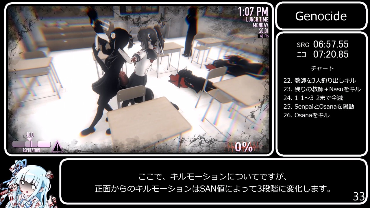 アプデにギリギリ間に合ったので初投稿です。<br>A.I.VOICEを使用しています。ご了承ください。<br>解説がギッチギチになってしまいました。すみません。<br>本編は <a href="#" class="seekTime" data-seekTime="1:38" onclick="seekNicoPlayer('#1:38'); return false;">#1:38</a> 辺りから始まります。<br><br><strong>10/11にアップデートが配信されました。新要素もいっぱいあるみたいです!<br>→<a href="https://www.yanderesimulator.com/download/" target="_blank" rel="noopener nofollow">https://www.yanderesimulator.com/download/</a></strong><br><br><strong><u>レギュレーション<br>ジェノサイドエンド達成<br>計測区間:空ファイル選択~暗転しムービーに入るまで<br>Speedrun仕様(SRC)…ロード時間は計測しない<br>ニコニコ仕様…ロード時間も計測</u></strong><br><br>(走ったビルド:6/17/2021ビルド)<br><br>Speedrun仕様のタイマー付けただけ版→<a href="https://youtu.be/fhUtCYDXGu0" target="_blank" rel="noopener nofollow">https://youtu.be/fhUtCYDXGu0</a><br><br>先駆者様<br>LABO兄貴→<a href="https://www.nicovideo.jp/watch/sm39010047" class="watch">sm39010047</a><br><br>前→<a href="https://www.nicovideo.jp/watch/sm39402570" class="watch">sm39402570</a><br>次→<a href="https://www.nicovideo.jp/watch/sm39601274" class="watch">sm39601274</a><br>RTAマイリス→<a href="https://www.nicovideo.jp/mylist/74656323" target="_blank" rel="noopener">mylist/74656323</a><br><br><strong>かわいい立ち絵を描いてくださったチカ兄貴→<a href="https://www.nicovideo.jp/user/116945047" target="_blank" rel="noopener">user/116945047</a></strong><br>その他お借りした素材はコンテンツツリーをご覧ください。