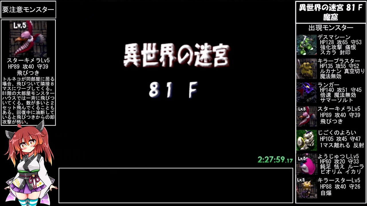 こいつよくクリアできたな。<br><br>動画内容<br> 魔窟(81F~99F)<br> 反省会(17:15~)<br><br>お借りした立ち絵:りんどう様 <a href="https://seiga.nicovideo.jp/seiga/im10261811" target="_blank" rel="noopener">im10261811</a><br><br>マイリスト:<a href="https://www.nicovideo.jp/mylist/71596448" target="_blank" rel="noopener">mylist/71596448</a><br><a href="https://www.nicovideo.jp/watch/sm39407366" class="watch">sm39407366</a> ← 前 次 → ポポロ異世界:<a href="https://www.nicovideo.jp/watch/sm39569572" class="watch">sm39569572</a><br><br>【追記】<br>おまけの動画は異世界高レベルプレイです。<br>90~99階を巡回降りしてますがダースは2体でした…。(憤怒)<br>ワナの巻物の仕様については知りませんでした。<br>教えてくれてありがとナス。<br><span style="color: #ff0000;">【訂正】<br>かなしばり状態の敵ではひょうがまじんは回り込みませんでした…。<br>店長と同階層に出るスペクテットの鉄化状態を活用してください。<br>ご指摘ありがとナス。&ガバ解説申し訳ナス。</span><br><br>たくさんのご視聴、いいね!、コメント、広告、フォロー、<br>マイリス登録ありがとうございます。