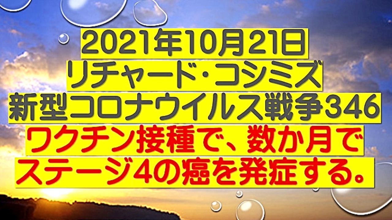 <span style="color: #cc4125;"><strong>「 テーマ:新型コロナウイルス戦争 346 」</strong></span><br><br><span style="color: #ff0000;"><strong>「 新型コロナワクチン接種により、数ヶ月で『 ステージ4の癌 』を発症する 」</strong></span><br><br><span style="color: #0000ff;"><strong>「 秋口から、スパイクタンパクによる新型コロナワクチン接種者の血栓症発症。<br> 脳血管障害・心血管障害・高血圧・精神疾患・失明・糖尿病など。ワクチン<br> 接種者のADE(抗体依存性感染増強)発症。新型コロナ変異株流行時、感染により重症化 」</strong></span><br><br> <span style="color: #38761d;">◆</span><span style="color: #38761d;"><strong>リチャード・コシミズ 公式 ブログ</strong></span><br> <a href="https://ameblo.jp/richardneversurrender/" target="_blank" rel="noopener nofollow">https://ameblo.jp/richardneversurrender/</a><br><br> <span style="color: #38761d;">◆</span><span style="color: #38761d;"><strong>リチャード・コシミズ 公式 ホームページ</strong></span><br> <a href="http://richardkoshimizu.boo.jp/" target="_blank" rel="noopener nofollow">http://richardkoshimizu.boo.jp/</a><br><br> <span style="color: #38761d;">◆</span><span style="color: #38761d;"><strong>リチャード・コシミズ 講演会 公式 動画ギャラリー</strong></span><br> <a href="http://www.t-sskk.com/richardkoshimizu/video-gallery/index.html" target="_blank" rel="noopener nofollow">http://www.t-sskk.com/richardkoshimizu/video-gallery/index.html</a><br>