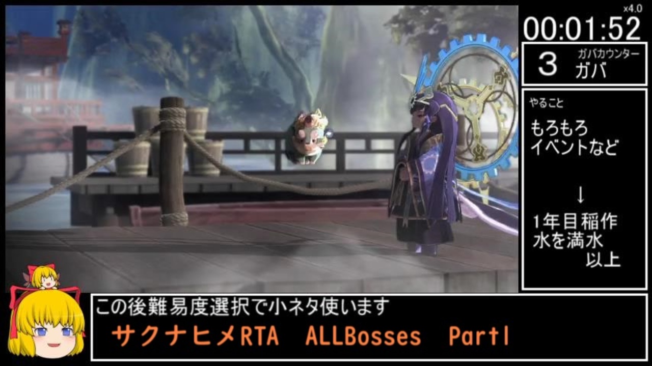(やり込み要素を含むRTAは)初投稿です。<br><br>とりあえず新しいレギュレーションの提案まで<br>ゲームによってはバージョン違いで走るものも見かけるので<br>旧バージョンでも走れる100層までを対象としています<br><span style="color: #b7b7b7;">(300層までとなると+武器ドロップ運ゲーになるので・・・)</span><br><br>使用バージョン:Sep,18,2021<br>レギュレーション:AllBosses<br>計測区間<br> 開始点:最初から選択時<br> 終了点:天返宮100層攻略後龍神の骨取得まで<br>難易度選択<br> 戦闘:低<br> 稲作:低<br>その他<br> バグ利用についてはAny%に準拠<br> 討伐必須ボスは以下の通り<br>・豚鬼大将・赤胴(化け茄子の胎)・椿蝦蟇 ・大鯰鬼 ・黄泉火産霊(赤耀山)<br>・石丸 ・黄泉椿蝦蟇(常夜の怨樹叢)・黄泉大鯰鬼(常夜の無尽瀧)<br>・黄泉石丸(常夜の裏城)・豚鬼大将・赤胴(流れ集いし無明)<br>・黄泉火産霊(常夜の怨燎洞)・大禍大龍<br>・天返宮5層ごと全ボス ・天返宮100層サクナ<br><br>次→<a href="https://www.nicovideo.jp/watch/sm39540778" class="watch">sm39540778</a><br>Part1→ここ<br>マイリスト→<a href="https://www.nicovideo.jp/mylist/70187820" target="_blank" rel="noopener">mylist/70187820</a><br><br>RTA/TAのPart1集→<a href="https://www.nicovideo.jp/mylist/70191093" target="_blank" rel="noopener">mylist/70191093</a><br>縛.りプレイのPart1集→<a href="https://www.nicovideo.jp/mylist/70191091" target="_blank" rel="noopener">mylist/70191091</a>
