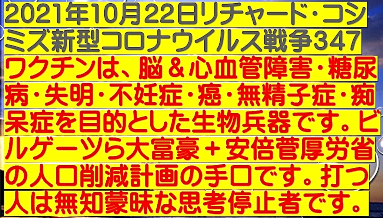 <span style="color: #cc4125;"><strong>「 テーマ:新型コロナウイルス戦争 347 」</strong></span><br><br><span style="color: #ff0000;"><strong>「新型コロナワクチンは、脳 & 心血管障害・糖尿病・失明・不妊症・癌・無精子症<br> ・痴呆症を目的とした『生物兵器』です。ビル・ゲイツら大富豪+安倍晋三・菅義偉<br> ・厚生労働省の人口削減計画の手口です。ワクチンを打つ人は、無知蒙昧な思考停止者です」</strong></span><br><br> <span style="color: #38761d;">◆</span><span style="color: #38761d;"><strong>リチャード・コシミズ 公式 ブログ</strong></span><br> <a href="https://ameblo.jp/richardneversurrender/" target="_blank" rel="noopener nofollow">https://ameblo.jp/richardneversurrender/</a><br><br> <span style="color: #38761d;">◆</span><span style="color: #38761d;"><strong>リチャード・コシミズ 公式 ホームページ</strong></span><br> <a href="http://richardkoshimizu.boo.jp/" target="_blank" rel="noopener nofollow">http://richardkoshimizu.boo.jp/</a><br><br> <span style="color: #38761d;">◆</span><span style="color: #38761d;"><strong>リチャード・コシミズ 講演会 公式 動画ギャラリー</strong></span><br> <a href="http://www.t-sskk.com/richardkoshimizu/video-gallery/index.html" target="_blank" rel="noopener nofollow">http://www.t-sskk.com/richardkoshimizu/video-gallery/index.html</a><br>
