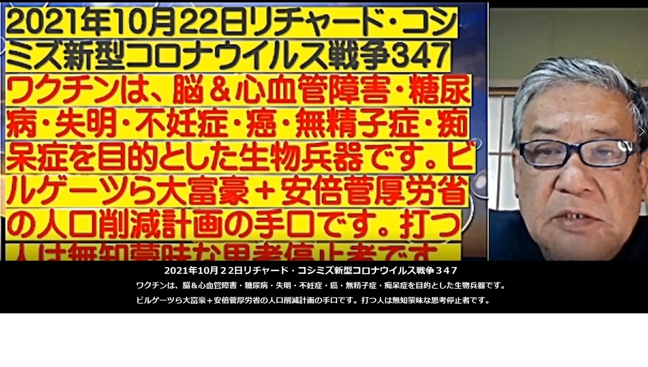 更新:2021年10月22日リチャード・コシミズ新型コロナウイルス戦争347ワクチンは、脳&心血管障害・糖尿病・失明・不妊症・癌・無精子症・痴呆症を目的とした生物兵器です。ビルゲーツら大富豪+安倍菅厚労省の人口削減計画の手口です。打つ人は無知蒙昧な思考停止者です。<br><br>環状RNAを覚えよう<br><br><a href="https://video.fc2.com/content/20211022ATunpW4r" target="_blank" rel="noopener nofollow">https://video.fc2.com/content/20211022ATunpW4r</a> または<br><a href="https://www.facebook.com/richard.koshimizu.5/videos/366904638547420/?notif_id=1634918555678649&notif_t=video_processed&ref=notif" target="_blank" rel="noopener nofollow">https://www.facebook.com/richard.koshimizu.5/videos/366904638547420/?notif_id=1634918555678649&notif_t=video_processed&ref=notif</a><br><br>●脳梗塞も心筋梗塞もワクチン接種によるスパイクタンパク産生が原因<br>●視力低下・失明も血栓症。<br>●何故、厚労省が関連性を認めないのか?厚労省は、ビル・ゲーツのワクチン大虐殺計画の共犯だから。<br>●ワクチン後の帯状疱疹は、免疫低下の証拠。次は、癌発症。<br>●コロナ後遺症で25%が無精子症。ワクチンでは?<br>●ワクチン打っても打たなくても重症者・死者無し。<br>●ワクチン3回目有効性95.6%?98.6%は感染しないが。<br>●マスコミが国民を騙す?共犯です。<br>●日本以外は、IVMで着々とコロナ退治。<br>●変異株攻勢が用意されている。接種者が真っ先にADE感染・重症化<br>
