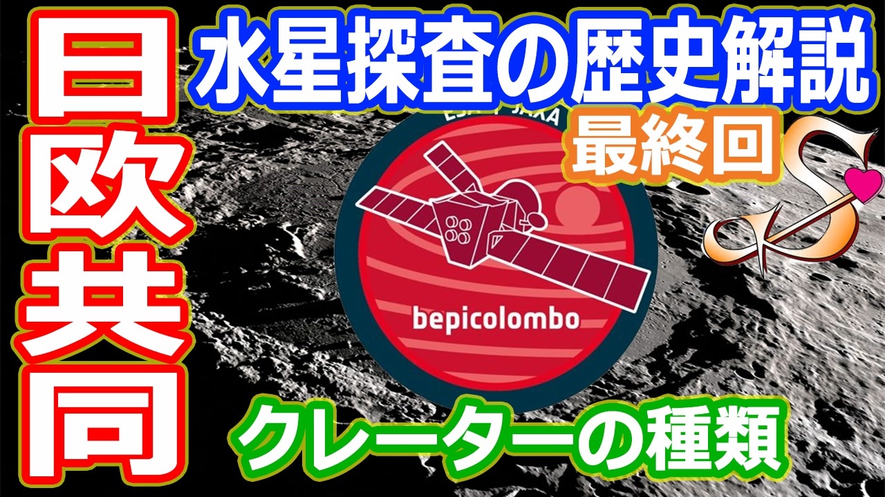 前編 <a href="https://www.nicovideo.jp/watch/sm39468572" class="watch">sm39468572</a><br>後編 <a href="https://www.nicovideo.jp/watch/sm39478268" class="watch">sm39478268</a><br>後編の後編 <a href="https://www.nicovideo.jp/watch/sm39490880" class="watch">sm39490880</a><br>最終回 <a href="https://www.nicovideo.jp/watch/sm39507272" class="watch">sm39507272</a><br>最終回R <a href="https://www.nicovideo.jp/watch/sm39517396" class="watch">sm39517396</a><br>今回は、水星探査の歴史の最終回Sです<br>予定されていた1年間の観測を終えたメッセンジャーがまだ働けることを知ったNASAはもう1年続ける決定をしました<br>無事に延長ミッションをクリアした後、さらに延長することになり<br>合計4年間も観測したメッセンジャーは、水星に突撃していきました<br>およそ16mのクレーターができたと推測されていますが、クレーターにも衝撃によって種類があるのをご存知ですか?<br>メッセンジャーが頑張っている間、地上では宇宙研が水星探査の検討をしていました<br>どうしてヨーロッパと組むことになったのか、Bepicolomboにはどんな観測機器が搭載されているのか解説します<br>【いちおし宇宙系】<br>・アマゾンリンク<br><a href="https://amzn.to/2S8xjpH" target="_blank" rel="noopener nofollow">https://amzn.to/2S8xjpH</a><br>・元JAXA研究員も驚いた! ヤバい「宇宙図鑑」<br><a href="https://amzn.to/3awwble" target="_blank" rel="noopener nofollow">https://amzn.to/3awwble</a><br>・はじめてのうちゅうえほん(子ども向け)<br><a href="https://amzn.to/3iTLY22" target="_blank" rel="noopener nofollow">https://amzn.to/3iTLY22</a><br><br>公平性や中立性を考えてアフィリエイトリンクは控えていましたが、得た収益を次のレビュー書籍や機材代にするために始めました<br>よろしくお願いします<br><br>へえ~と思ったらチャンネル登録と高評価をお願います<br>ツイッターでは、たまに宇宙ネタをつぶやいています<br><br>◆チャンネル登録はこちら<br><a href="http://www.youtube.com/channel/UChOv-TZWg3X4MDjFUF8CfQg?sub_confirmation=1" target="_blank" rel="noopener nofollow">http://www.youtube.com/channel/UChOv-TZWg3X4MDjFUF8CfQg?sub_confirmation=1</a><br>◆サブチャンネル(スカイ三平の雑多推進研究所)<br><a href="http://www.youtube.com/channel/UCpQEOLtOpmXUwslvgi93yQw?sub_confirmation=1" target="_blank" rel="noopener nofollow">http://www.youtube.com/channel/UCpQEOLtOpmXUwslvgi93yQw?sub_confirmation=1</a><br>◆twitterはこちら<br><a href="https://twitter.com/skysanpei" target="_blank" rel="noopener nofollow">https://twitter.com/skysanpei</a>