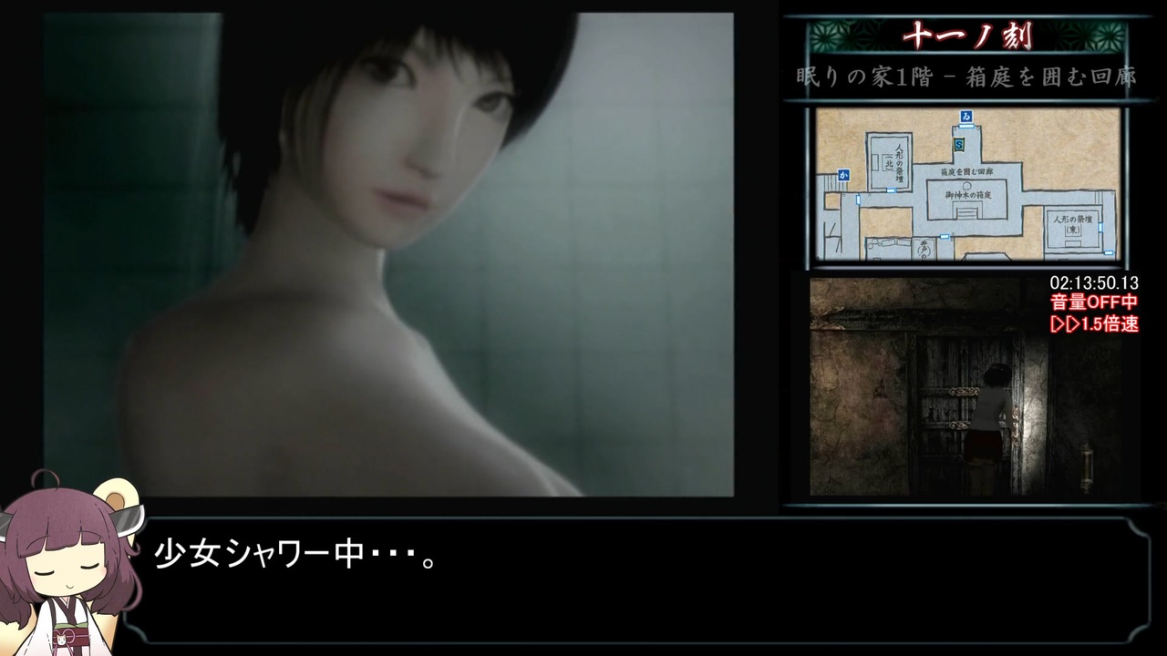 遅くなりました。申し訳ナス!<br>あと、(マップが)ないですの時のきりたんがネタ切れしてきました。どうすっかな~俺もな~<br><br>十一ノ刻開始~終了まで<br><br><a href="https://www.nicovideo.jp/watch/sm39482043" class="watch">sm39482043</a>←前|<a href="https://www.nicovideo.jp/mylist/71775161" target="_blank" rel="noopener">mylist/71775161</a>|次→<a href="https://www.nicovideo.jp/watch/sm39638169" class="watch">sm39638169</a><br><br>RTA part1集 <a href="https://www.nicovideo.jp/mylist/71936684" target="_blank" rel="noopener">mylist/71936684</a><br><br><strong><u>▼参考サイト様等</u></strong><br>・攻略フルーツ - 零 刺青の聲 - <a href="https://xn--cool-kk4csd1lrc8dvi.xyz/zero-koe/" target="_blank" rel="noopener nofollow">https://xn--cool-kk4csd1lrc8dvi.xyz/zero-koe/</a><br>・零~刺青ノ聲~ 公式完全攻略本 導魂之書 - 株式会社エンターブレイン<br><br><strong><u>▼お借りした素材達</u></strong><br>・【akihiyo様】:立ち東北きりたん素材 - <a href="https://seiga.nicovideo.jp/seiga/im10601764" target="_blank" rel="noopener">im10601764</a><br>・【hiropon様】:指さし棒 - <a href="https://commons.nicovideo.jp/works/nc190353" target="_blank" rel="noopener">nc190353</a><br>・【公式様】:東北ずん子のイラスト/3Dデータ - <a href="https://zunko.jp/con_illust.html" target="_blank" rel="noopener nofollow">https://zunko.jp/con_illust.html</a><br><br><strong><u>▼プレイ環境</u></strong><br>・本体(実機):SCPH-30000<br>・コントローラ:SCPH-10010<br>・ディスク:廉価版のやつ<br><br><strong><u>▼レギュレーション/縛り等</u></strong><br>・計測開始:1周目開始時New GameからNormalを選択した瞬間<br>・計測終了:2周目終了時リザルト画面にて「霊リスト:217/217」が表示された瞬間<br>・難易度は2周ともNormal<br>・エンディングは2周ともノーマルエンド<br>・バグ技はなんでもあり<br>