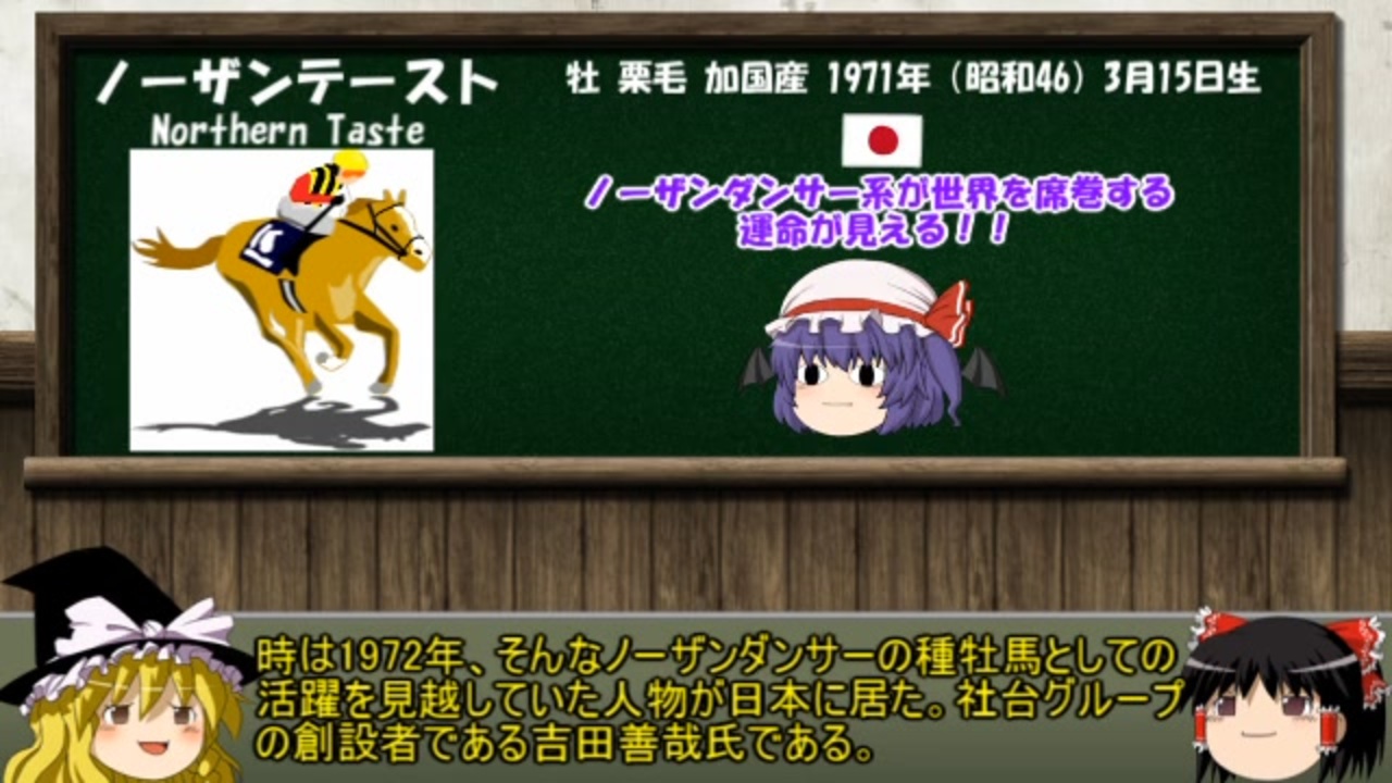 前作<a href="https://www.nicovideo.jp/watch/sm39325187" class="watch">sm39325187</a> 次作<a href="https://www.nicovideo.jp/watch/sm39693992" class="watch">sm39693992</a> 牝馬シリーズマイリス<a href="https://www.nicovideo.jp/mylist/65869255" target="_blank" rel="noopener">mylist/65869255</a> 競馬解説マイリス<a href="https://www.nicovideo.jp/mylist/64207040" target="_blank" rel="noopener">mylist/64207040</a> <br><br>つべ<a href="https://youtu.be/V9_QpZ3NyRM" target="_blank" rel="noopener nofollow">https://youtu.be/V9_QpZ3NyRM</a><br><br>名馬解説第13弾、ノーザンテーストです。<br>現代日本競馬は世界に通用するようになったのも、サンデーが日本にやってきたのも<br>彼の功績があったこそからなのです。<br><br>…でも直系は途絶えてしまうのよね(´・ω・`)<br><br>BGM:甘茶の音楽工房様<br>画像提供元: TURF☆DUST 様 うまぽっと様 いらすとや様 きつねゆっくり様<br>参考HP:優駿達の蹄跡様 netkeiba.com Wikipedia JRA JBISサーチ ニコニコ大百科(仮)