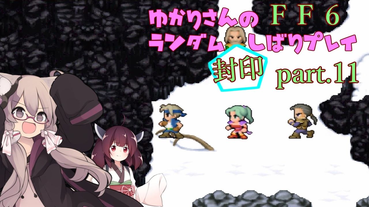 FF6のランダム封印縛り第十一回です。<br>そろそろ封印神様のエンジンがかかってきた模様。<br>よろしくお願いします。<br><br>次回の投稿は遅れると思います。<br><br>【ルール及び目標】<br>・1レベルアップで1封印<br>・歩数ガバ1回で1封印<br>・5の倍数の封印は取得済、習得済から抽選<br>・封印物は売却可、コロシアム可<br>・アイテムコンプリート(だいじなもの除く)<br>・魔石コンプリート<br>・魔法と暴れる以外のアビリティコンプリート<br>・仲間は全員揃える<br>・なるべく低歩数<br>・バグ技は使わない<br><br>【封印対象】418件<br>・各種アイテム、装備品<br>・魔法<br>・魔石<br>・暴れる以外のコマンドアビリティ<br><br>【封印対象外】<br>・ぬすむ<br>・魔石ラグナロック<br>・ちぬられたたて<br>・ものまね<br>・テレポ<br><br>【お借りした立ち絵】<br>夏樹テル様 <a href="https://seiga.nicovideo.jp/seiga/im7077733" target="_blank" rel="noopener">im7077733</a>、<a href="https://seiga.nicovideo.jp/seiga/im9245138" target="_blank" rel="noopener">im9245138</a><br>-翠-様 <a href="https://seiga.nicovideo.jp/seiga/im7909843" target="_blank" rel="noopener">im7909843</a><br><br>前回:<a href="https://www.nicovideo.jp/watch/sm39378989" class="watch">sm39378989</a><br>一覧:<a href="https://www.nicovideo.jp/series/229325" target="_blank" rel="noopener">series/229325</a><br><br>他動画シリーズもよろしくお願いします。<br>デュエルリンクス:<a href="https://www.nicovideo.jp/series/36738" target="_blank" rel="noopener">series/36738</a><br>ディグダ縛り(ポケモン盾):<a href="https://www.nicovideo.jp/series/141165" target="_blank" rel="noopener">series/141165</a>