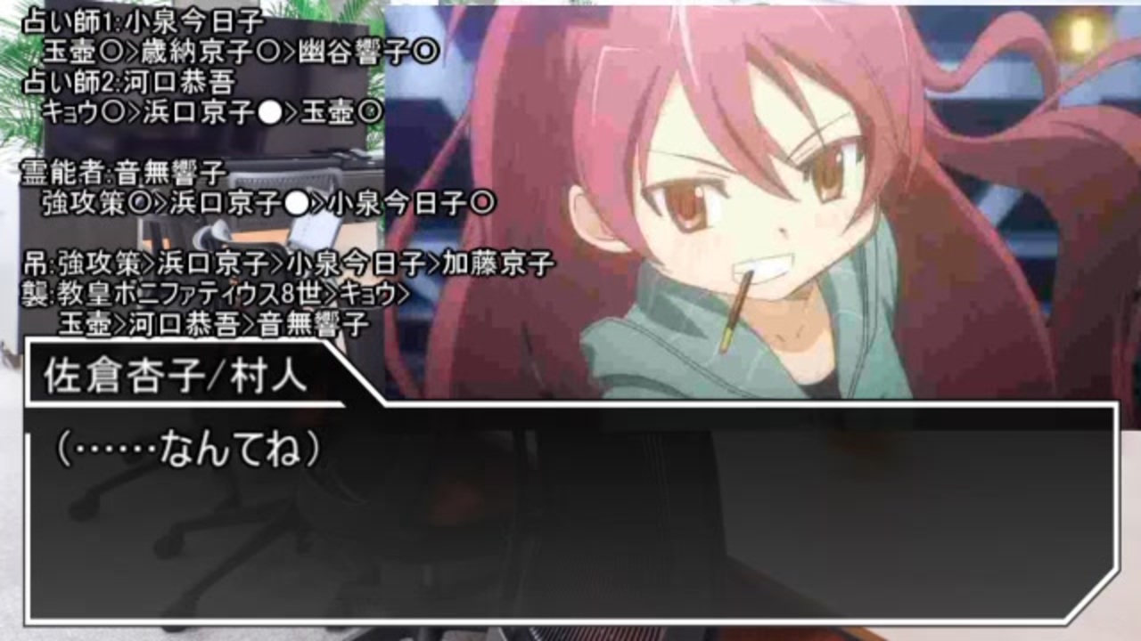 お待たせして本当申し訳ございませんでした!(2か月ぶり4回目)<br><span style="color: #ff0000;">本編は5:50~です<br>茶番パートが不要な方は飛ばしてください</span><br><br>ロイヤルな人と結婚しようとしたり、浮気相手とのチャットが流出して炎上したりしていました。<br><br>前回:<a href="https://www.nicovideo.jp/watch/sm39212368" class="watch">sm39212368</a><br>次回:<a href="https://www.nicovideo.jp/watch/sm39691281" class="watch">sm39691281</a><br><br>◆ややこしい人狼シリーズ<br><a href="https://www.nicovideo.jp/mylist/70623486" target="_blank" rel="noopener">mylist/70623486</a><br><br>■過去のシリーズ<br>◆詰め合わせ人狼シリーズ(完結済)<br><a href="https://www.nicovideo.jp/mylist/68669592" target="_blank" rel="noopener">mylist/68669592</a><br>◆名前吊り人狼シリーズ(完結済)<br><a href="https://www.nicovideo.jp/mylist/70399468" target="_blank" rel="noopener">mylist/70399468</a><br><br>Twitterを始めました!<br><a href="https://twitter.com/puuuuma_desu" target="_blank" rel="noopener nofollow">https://twitter.com/puuuuma_desu</a><br><br>■ニコニ広告のお礼が長くなってしまうため、投稿者コメントからは割愛させていただきます…… ですがちゃんと見ております!皆様ありがとうございます!<br><br>