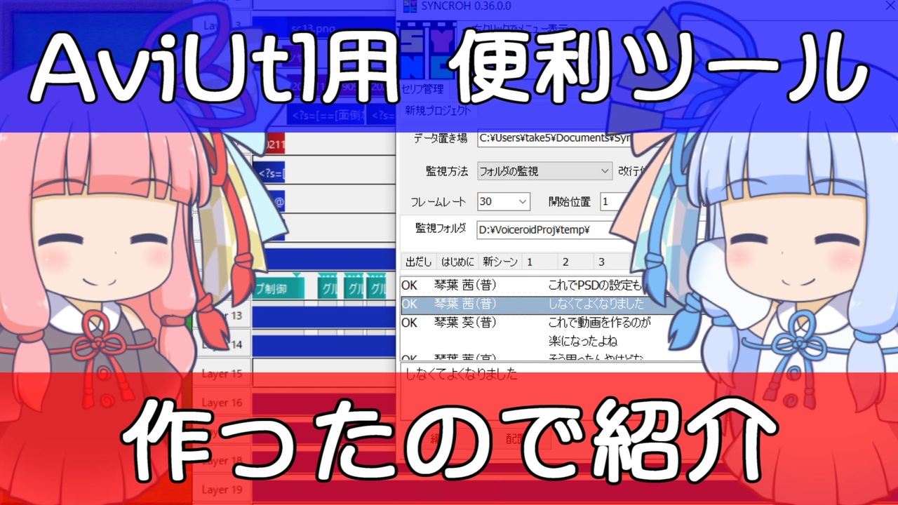 AviUtlを便利にするツール作りました<br>【コメ返し】Q.音声ファイルが短くなる。A.60fps編集の場合は環境設定の確認をMP3で可変ビットレートだとうまく計算出来ないかも、対応方法を考えます。<br><br>ANMの作成、PSD立ち絵を設定込みで貼り付け、セリフの流し込みなどが出来ます。<br><br>ダウンロードはこちら<br><a href="https://drive.google.com/drive/folders/1kQ6j3eVYegQQaNLozQToJUZ3XvNE-zxV?usp=sharing" target="_blank" rel="noopener nofollow">https://drive.google.com/drive/folders/1kQ6j3eVYegQQaNLozQToJUZ3XvNE-zxV?usp=sharing</a><br><br>質問、要望、バグ報告はTwitterへ<br><a href="https://twitter.com/vramwiz" target="_blank" rel="noopener nofollow">https://twitter.com/vramwiz</a><br><br>ドラッグアンドドロップとかは不安定になるので対策中<br><br><br /><span style="color: #262626;">新旧朗2 1.11b AviUtl2 Beta25用</span><br>2026/1/19 12:00 更新<br><br>専用サイト<br><a href="https://vramwiz.github.io/Syncroh2-site/" target="_blank" rel="noopener nofollow">https://vramwiz.github.io/Syncroh2-site/</a><br><span style="color: #262626;">インストール版<br><a href="https://drive.google.com/uc?id=1b-5AXhII2z0ATOAinYyBJTviIA6Y4eH-" target="_blank" rel="noopener nofollow">https://drive.google.com/uc?id=1b-5AXhII2z0ATOAinYyBJTviIA6Y4eH-</a><br>手動セットアップ版<br><a href="https://drive.google.com/uc?id=1Grz3N5zdjlLYeS1jByWIDWkhDBJxWI7K" target="_blank" rel="noopener nofollow">https://drive.google.com/uc?id=1Grz3N5zdjlLYeS1jByWIDWkhDBJxWI7K</a></span><br><br>ニコニコモンズ<br><a href="https://commons.nicovideo.jp/works/nc443168" target="_blank" rel="noopener">nc443168</a><br><br>音声合成ソフト:VOICEROID2 琴葉姉妹<br>立ち絵:EST様<br>仕様効果音:効果音ラボ様<br>フォント:ラノベ POP V2<br><br>支援品リストを作りました(宅配BOXがあるのでいつでも大丈夫です)<br><a href="https://www.amazon.jp/hz/wishlist/ls/23MIFZ28DFCGG?ref_=wl_share" target="_blank" rel="noopener nofollow">https://www.amazon.jp/hz/wishlist/ls/23MIFZ28DFCGG?ref_=wl_share</a><br>