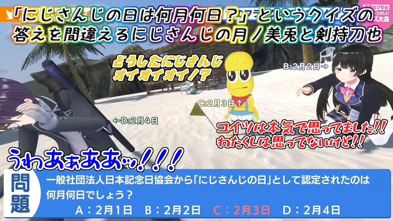 にじさんじの記念日わからんにじさんじ所属の人間なんておる?<br><br>本家参考動画<br>・リゼ・ヘルエスタ<br>【#なとリゼクイズ大会】名取&リゼのたのしいたのしいクイズ大会<br><a href="https://youtu.be/SHtggEEjJCM" target="_blank" rel="noopener nofollow">https://youtu.be/SHtggEEjJCM</a><br><br>参考元チャンネル&Twitter<br>・月ノ美兎<br><a href="https://www.youtube.com/channel/UCD-miitqNY3nyukJ4Fnf4_A" target="_blank" rel="noopener nofollow">https://www.youtube.com/channel/UCD-miitqNY3nyukJ4Fnf4_A</a><br><a href="https://twitter.com/MitoTsukino" target="_blank" rel="noopener nofollow">https://twitter.com/MitoTsukino</a><br>・剣持刀也<br><a href="https://www.youtube.com/channel/UCv1fFr156jc65EMiLbaLImw" target="_blank" rel="noopener nofollow">https://www.youtube.com/channel/UCv1fFr156jc65EMiLbaLImw</a><br><a href="https://twitter.com/rei_Toya_rei" target="_blank" rel="noopener nofollow">https://twitter.com/rei_Toya_rei</a><br>・ピーナッツくん<br><a href="https://www.youtube.com/channel/UCmgWMQkenFc72QnYkdxdoKA" target="_blank" rel="noopener nofollow">https://www.youtube.com/channel/UCmgWMQkenFc72QnYkdxdoKA</a><br><a href="https://twitter.com/osyarenuts" target="_blank" rel="noopener nofollow">https://twitter.com/osyarenuts</a><br>・ぽんぽこ<br><a href="https://www.youtube.com/channel/UC1EB8moGYdkoZQfWHjh7Ivw" target="_blank" rel="noopener nofollow">https://www.youtube.com/channel/UC1EB8moGYdkoZQfWHjh7Ivw</a><br><a href="https://twitter.com/ponpokoka" target="_blank" rel="noopener nofollow">https://twitter.com/ponpokoka</a><br>・リゼ・ヘルエスタ<br><a href="https://www.youtube.com/channel/UCZ1xuCK1kNmn5RzPYIZop3w" target="_blank" rel="noopener nofollow">https://www.youtube.com/channel/UCZ1xuCK1kNmn5RzPYIZop3w</a><br><a href="https://twitter.com/Lize_Helesta" target="_blank" rel="noopener nofollow">https://twitter.com/Lize_Helesta</a><br>・名取さな<br><a href="https://www.youtube.com/channel/UCIdEIHpS0TdkqRkHL5OkLtA" target="_blank" rel="noopener nofollow">https://www.youtube.com/channel/UCIdEIHpS0TdkqRkHL5OkLtA</a><br><a href="https://twitter.com/sana_natori" target="_blank" rel="noopener nofollow">https://twitter.com/sana_natori</a><br><br>べーた さん<br>新しいニックネーム さん<br>UNP さん<br>にじさんじの日 さん<br>クロワッサンさん さん<br>たぬきそば さん<br>広告ありがとうございます<br><br>ニコニコのダイコンマンリスト<br>「バーチャルYouTuberシリーズ」↓<br><a href="https://www.nicovideo.jp/mylist/62551838" target="_blank" rel="noopener">mylist/62551838</a><br>「バーチャルYouTuberシリーズ2」↓<br><a href="https://www.nicovideo.jp/mylist/67858437" target="_blank" rel="noopener">mylist/67858437</a><br>「バーチャルYouTuberシリーズ3」↓<br><a href="https://www.nicovideo.jp/mylist/71340675" target="_blank" rel="noopener">mylist/71340675</a><br><br>ダイコンマンのTwitter<br><a href="https://twitter.com/Daikon_Man_V" target="_blank" rel="noopener nofollow">https://twitter.com/Daikon_Man_V</a>