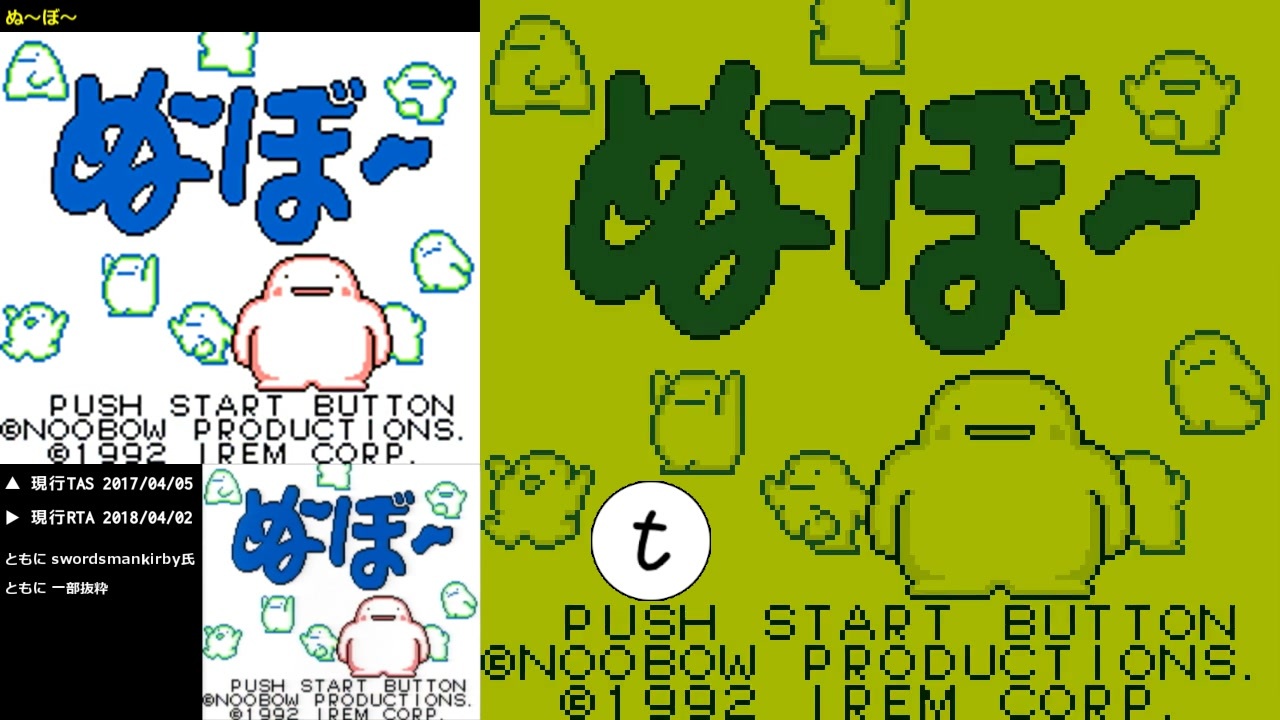 <a href="https://www.nicovideo.jp/watch/sm39545414" class="watch">sm39545414</a>(<strong>まっすぐ</strong>氏, 2021/11/02)を見て作りたくなりました。<br>現行TAS より 13秒ほど縮みました。(嬉しい)<br><br><br>ゲームボーイ ぬ~ぼ~ (Noobow) の TAS の試走です。<br>下記の現行TAS によると、32:52.408 とのことなので、<br>12.725秒ほど短縮できたようです。(嬉しい)<br><br> フレーム数 : 117047F 追記数: 34967<br><br>なお、現行TASさん と 現行RTAさん は同じ方であり、<br>下記の 現行RTA のほうが 現行TAS より早いです。<br><br> [現行TAS]<strong>swordsmankirby</strong>氏, 2017/07,<br> <a href="https://www.youtube.com/watch?v=yKQw4DpgZBw" target="_blank" rel="noopener nofollow">https://www.youtube.com/watch?v=yKQw4DpgZBw</a> <br><br> [現行RTA]<strong>swordsmankirby</strong>氏, 2018/04,<br> <a href="https://www.youtube.com/watch?v=sXxAws5x_GQ" target="_blank" rel="noopener nofollow">https://www.youtube.com/watch?v=sXxAws5x_GQ</a><br><br>手順は概ね 現行RTA のものを参考にしました。<br>TAS より RTA のほうが早い、という状態を解消できて嬉しく思います。<br><br><br>[関連 投稿TAS および サイト]<br><a href="https://www.nicovideo.jp/watch/sm34231690" class="watch">sm34231690</a> FC ソロモンの鍵2 クールミン島救出作戦 [2018/11]<br><a href="https://www.nicovideo.jp/watch/sm34170505" class="watch">sm34170505</a> GB 倉庫番 [2018/11]<br><a href="https://www.nicovideo.jp/mylist/59844781" target="_blank" rel="noopener">mylist/59844781</a> 投稿した GB, GBC TAS<br><a href="https://www.speedrun.com/noobow" target="_blank" rel="noopener nofollow">https://www.speedrun.com/noobow</a><br /><br>------------- 以下 共通説明文 -------------<br><br><strong>PIXIV FANBOX や Amazon にて支援を募っています。よかったらぜひ。<br>FANBOX : <a href="https://www.fanbox.cc/@tas-suki" target="_blank" rel="noopener nofollow">https://www.fanbox.cc/@tas-suki</a><br>Wish List : <a href="https://www.amazon.co.jp/hz/wishlist/ls/3M57V3BKOO1N9" target="_blank" rel="noopener nofollow">https://www.amazon.co.jp/hz/wishlist/ls/3M57V3BKOO1N9</a></strong><br><br><strong>twitter : <a href="https://twitter.com/tas_suki" target="_blank" rel="noopener nofollow">https://twitter.com/tas_suki</a><br>RTA : <a href="https://www.speedrun.com/user/tas_suki" target="_blank" rel="noopener nofollow">https://www.speedrun.com/user/tas_suki</a></strong><br><br><span style="color: #20124d;"><strong>※ 2021/10 以降は、不定期に動画を投稿しています。</strong></span><br><br> ・Posted TASes (recently)<br>05/31 <a href="https://www.nicovideo.jp/watch/sm42293404" class="watch">sm42293404</a> (PC)<br>04/30 <a href="https://www.nicovideo.jp/watch/sm42136556" class="watch">sm42136556</a> (PC)<br>02/28 <a href="https://www.nicovideo.jp/watch/sm41812217" class="watch">sm41812217</a> (MD)<br>12/25 <a href="https://www.nicovideo.jp/watch/sm41553821" class="watch">sm41553821</a> (PC)<br>11/08 <a href="https://www.youtube.com/watch?v=Lj6N0bm3lyo" target="_blank" rel="noopener nofollow">https://www.youtube.com/watch?v=Lj6N0bm3lyo</a> (PC)<br>09/29 <a href="https://www.youtube.com/watch?v=gRelRaVcyQg" target="_blank" rel="noopener nofollow">https://www.youtube.com/watch?v=gRelRaVcyQg</a> (PC)<br>07/01 <a href="https://www.youtube.com/watch?v=28G366IdmPE" target="_blank" rel="noopener nofollow">https://www.youtube.com/watch?v=28G366IdmPE</a> (PC)<br>05/31 <a href="https://www.nicovideo.jp/watch/sm40538452" class="watch">sm40538452</a> (PC)<br><br> ・Posted TASes (2016/04 ~ )<br><a href="http://www.nicovideo.jp/user/56935712/video" target="_blank" rel="noopener nofollow">http://www.nicovideo.jp/user/56935712/video</a><br><br> ・Posted TASes that are the current fastest records<br><a href="https://www.nicovideo.jp/series/74250" target="_blank" rel="noopener nofollow">https://www.nicovideo.jp/series/74250</a>