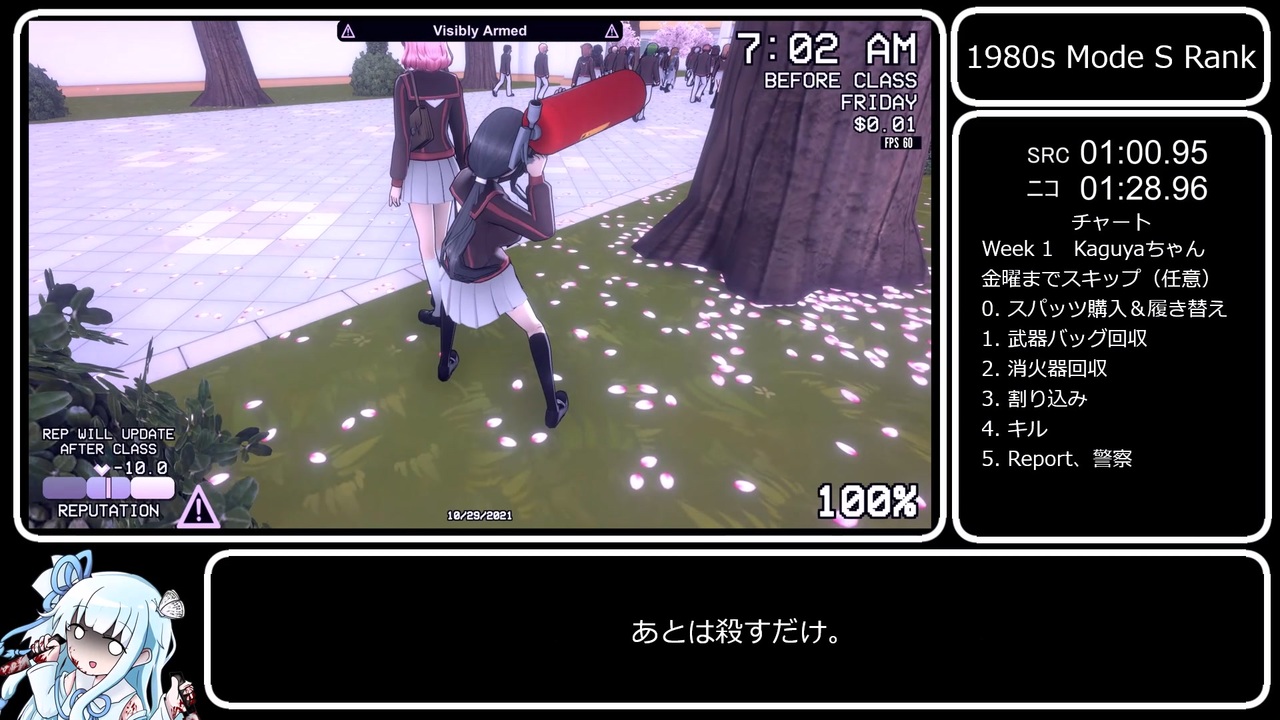 投稿間隔が空いてしまってごめんなさい!!!初投稿です。<br>A.I.VOICEを使用しています。ご了承ください。<br>新モード 1980年モードのRTAになります。一周が長いんじゃ…<br>本編は <a href="#" class="seekTime" data-seekTime="2:06" onclick="seekNicoPlayer('#2:06'); return false;">#2:06</a> から始まります。<br><br><strong><u>レギュレーション<br>1980年モードをSランクでクリア<br>計測区間:空ファイル選択~エンディング開始まで<br>Speedrun仕様(SRC)…ロード時間は計測しない<br>ニコニコ仕様…ロード時間も計測</u></strong><br><br>Speedrun仕様のタイマー付けただけ版→<a href="https://youtu.be/zXd4jJCxPcI" target="_blank" rel="noopener nofollow">https://youtu.be/zXd4jJCxPcI</a><br><br>二度再走したミッションモードRTA<br>1回目→<a href="https://youtu.be/ATGOWuvYO1o" target="_blank" rel="noopener nofollow">https://youtu.be/ATGOWuvYO1o</a><br>2回目→<a href="https://youtu.be/Wota0NnprYU" target="_blank" rel="noopener nofollow">https://youtu.be/Wota0NnprYU</a><br><br>カセットテープ翻訳→<a href="https://www.nicovideo.jp/watch/sm39306632" class="watch">sm39306632</a><br><br>補足:1980年モードのランクの仕様について(公式サイト)→<a href="https://yanderesimulator.com/s-rank/" target="_blank" rel="noopener nofollow">https://yanderesimulator.com/s-rank/</a><br><br>動画内で触れた兄貴<br>閉廷兄貴→<a href="https://www.nicovideo.jp/watch/sm39548583" class="watch">sm39548583</a>(倫理観放棄RTA)<br><br>前→<a href="https://www.nicovideo.jp/watch/sm39458126" class="watch">sm39458126</a><br>次→<a href="https://www.nicovideo.jp/watch/sm39675302" class="watch">sm39675302</a><br>RTAマイリス→<a href="https://www.nicovideo.jp/mylist/74656323" target="_blank" rel="noopener">mylist/74656323</a><br><span style="color: #ffffff;">いいねコメントの答え:ぱんつの色</span><br><strong>かわいい立ち絵を描いてくださったチカ兄貴→<a href="https://www.nicovideo.jp/user/116945047" target="_blank" rel="noopener">user/116945047</a></strong><br>その他お借りした素材はコンテンツツリーをご覧ください。