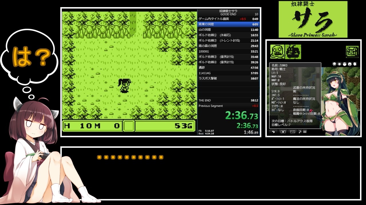 複数パートに分かれた動画は初投稿です<br><br>音量調節等は各自お願いします<br><br>カボテン(ウナきり推進派 兄貴*21、Q:re 兄貴*3、フーテンの名無しさん 兄貴*7、親子関係不存在確認訴訟 兄貴、犯人はYASU 兄貴、fortune 兄貴、すずむし 兄貴、waaaaaaaaaai 兄貴、ダイス 兄貴、tonton 兄貴、yao-lung 兄貴、Nukonuko 兄貴*2、アル・デ・ヴァラン 兄貴*7、KENT 兄貴、米男 兄貴、とくさん 兄貴、なちょ 兄貴、空蜂ミドロ 兄貴、こんぼら 兄貴*2、BIT 兄貴、NuruponZZ 兄貴*2、猫猪 兄貴*2、ヴェスパー 兄貴、園ジゅつ 兄貴、atora 兄貴、foobar 兄貴、パンツ屋 兄貴、謎肉 兄貴*2、be 兄貴、青空トマト 兄貴、マーモ 兄貴、ふじお 兄貴、IRIS@牛丼大盛つゆ表面張力 兄貴*2、イオン 兄貴、ATL 兄貴、ビーグル0806 兄貴*4、ABO 兄貴*2、けいす系 兄貴、姉妹愛 兄貴、バラモスバンパイア 兄貴、RF-90/EROべイター 兄貴、ネシャーマ 兄貴*6、BSxxx 兄貴、トミーバラク 兄貴*13、ここやし 兄貴*2、tilk 兄貴*3、CV 兄貴、にくまぞく 兄貴*12、いくさ人 兄貴、tatibana 兄貴、北の観光業 兄貴、Lui 兄貴、天田来吸 兄貴、へつ 兄貴、マサイのゲルググ 兄貴、strohmann 兄貴、kfnkr 兄貴、ひょん 兄貴、t82 兄貴、tomak_masakazu 兄貴<br><br><br><br>皆様本当に本当にありがとナス!<br>------<br>計測区間:スタートを選択した瞬間からエンディングのTHE ENDが表示されきるまで<br><br>録画環境:アマレココ<br>プレイ環境:PS初代のHORIコン+エレコム制コンバーター+R18パッチ適用<br><br>------<br>お借りした素材<br>ユメのオワリ氏の東北きりたん座り絵素材 > <a href="https://seiga.nicovideo.jp/seiga/im10696341" target="_blank" rel="noopener">im10696341</a><br><br>NULL氏のステータス画面ツクール > 先生のFantiaで探してね!<br><br>------<br>作品リンクはこちらです!!買うなら今!!<br><br>DLサイト > <a href="https://www.dlsite.com/maniax/work/=/product_id/RJ268158.html" target="_blank" rel="noopener nofollow">https://www.dlsite.com/maniax/work/=/product_id/RJ268158.html</a><br><br>STEAM > <a href="https://store.steampowered.com/app/1202280/" target="_blank" rel="noopener nofollow">https://store.steampowered.com/app/1202280/</a><br><br><br>------<br><br>次Part > まだまだです<br><br>------<br>投稿動画 > <a href="https://www.nicovideo.jp/mylist/37036251" target="_blank" rel="noopener">mylist/37036251</a><br><br>今までのRTAまとめ > <a href="https://www.nicovideo.jp/mylist/65423944" target="_blank" rel="noopener">mylist/65423944</a>