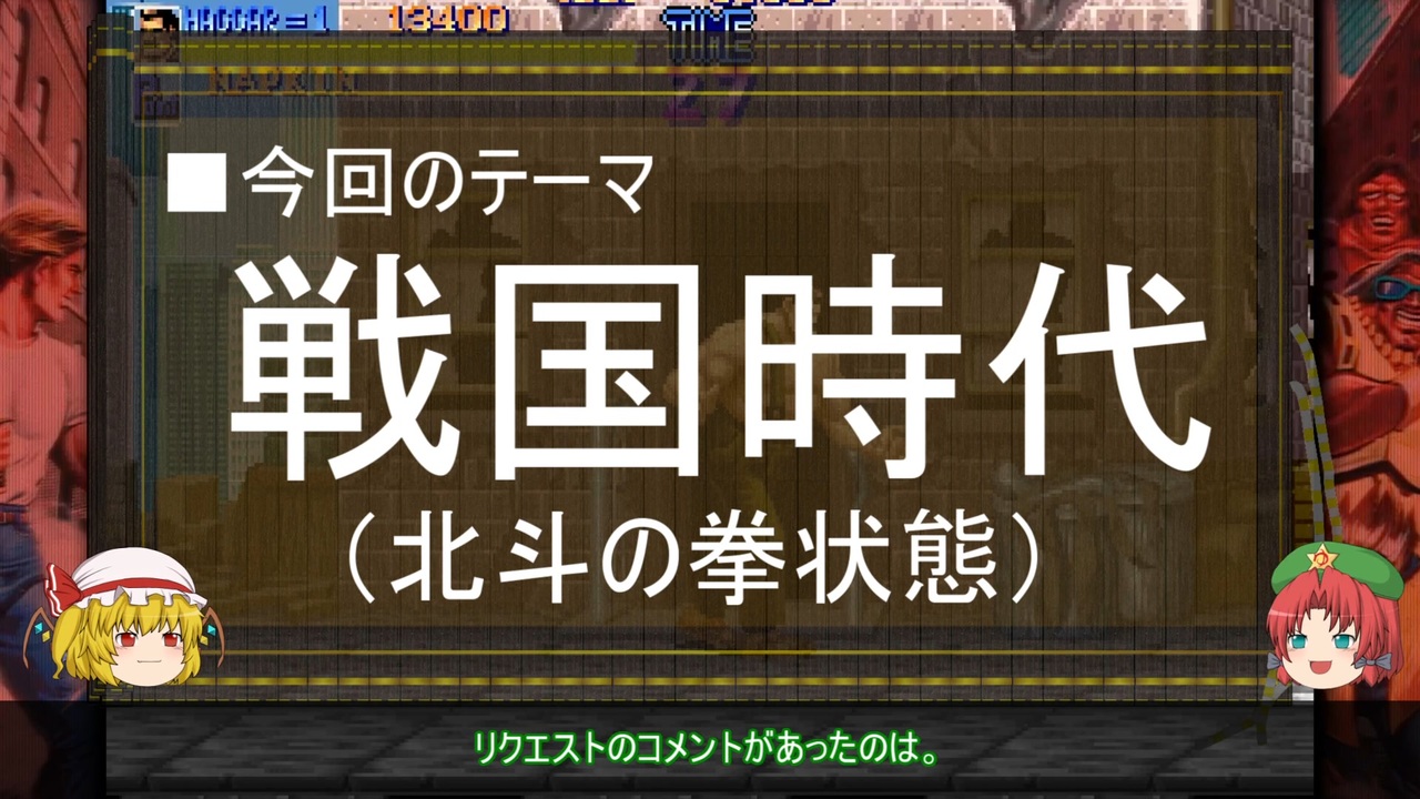 みんな大好き「戦国時代」と、この動画でよく使っている「北斗の拳状態」のご説明です。<br>「戦国時代に何が起きたか」ではなく「戦国時代とはどういった時代なのか」についてのご説明です。<br><br>☆参考サイト<br>■戦国時代勢力図と各大名の動向ブログ<br><a href="http://sengokumap.net/history/1575/" target="_blank" rel="noopener nofollow">http://sengokumap.net/history/1575/</a><br><br>■BGM<br>砂塵の城塞 秋山 裕和/ H/MIX GALLERY<br><a href="https://www.youtube.com/watch?v=St5xGcm4xl8&t=464s" target="_blank" rel="noopener nofollow">https://www.youtube.com/watch?v=St5xGcm4xl8&t=464s</a><br><br>■背景のゲーム<br>ファイナルファイト(カプコン ベルトアクション コレクション)<br><br>動画作成ツール:ゆっくりムービーメーカー3<br><a href="https://manjubox.net/ymm3/" target="_blank" rel="noopener nofollow">https://manjubox.net/ymm3/</a><br><br>立ち絵:キャラ素材(きつねゆっくり) - Nicotalk &キャラ素材配布所<br><a href="http://www.nicotalk.com/charasozai_kt.html" target="_blank" rel="noopener nofollow">http://www.nicotalk.com/charasozai_kt.html</a><br><br>AquesTalkライセンス購入済み<br>
