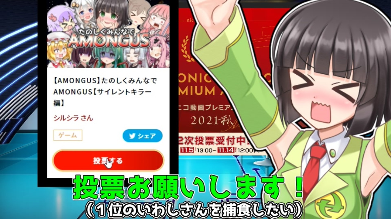 <span style="color: #262626; font-size: 24px;">ニコニコ動画プレミアムアワード秋 決勝投票開催中!</span><br><span style="color: #ff0000; font-size: 24px;"><strong>サイレントキラー編の応援よろしくお願いいたします!</strong></span><br><br><span style="font-size: 24px;"><strong>↓投票リンク↓</strong></span><br><span style="color: #0000ff; font-size: 24px;"><strong><a href="https://site.nicovideo.jp/premiumaward/nominated-video/" target="_blank" rel="noopener nofollow">https://site.nicovideo.jp/premiumaward/nominated-video/</a></strong></span><br><br>サイレントキラー編リンク<br><a href="https://www.nicovideo.jp/watch/sm38472448" target="_blank" rel="noopener nofollow">https://www.nicovideo.jp/watch/sm38472448</a><br><br><br>不幸があっていろいろとできませんでしたが落ち着いてきたので<br>今日明日くらいからまた動画編集始めたいと思います。<br><br><br>VOICEVOX:ずんだもん