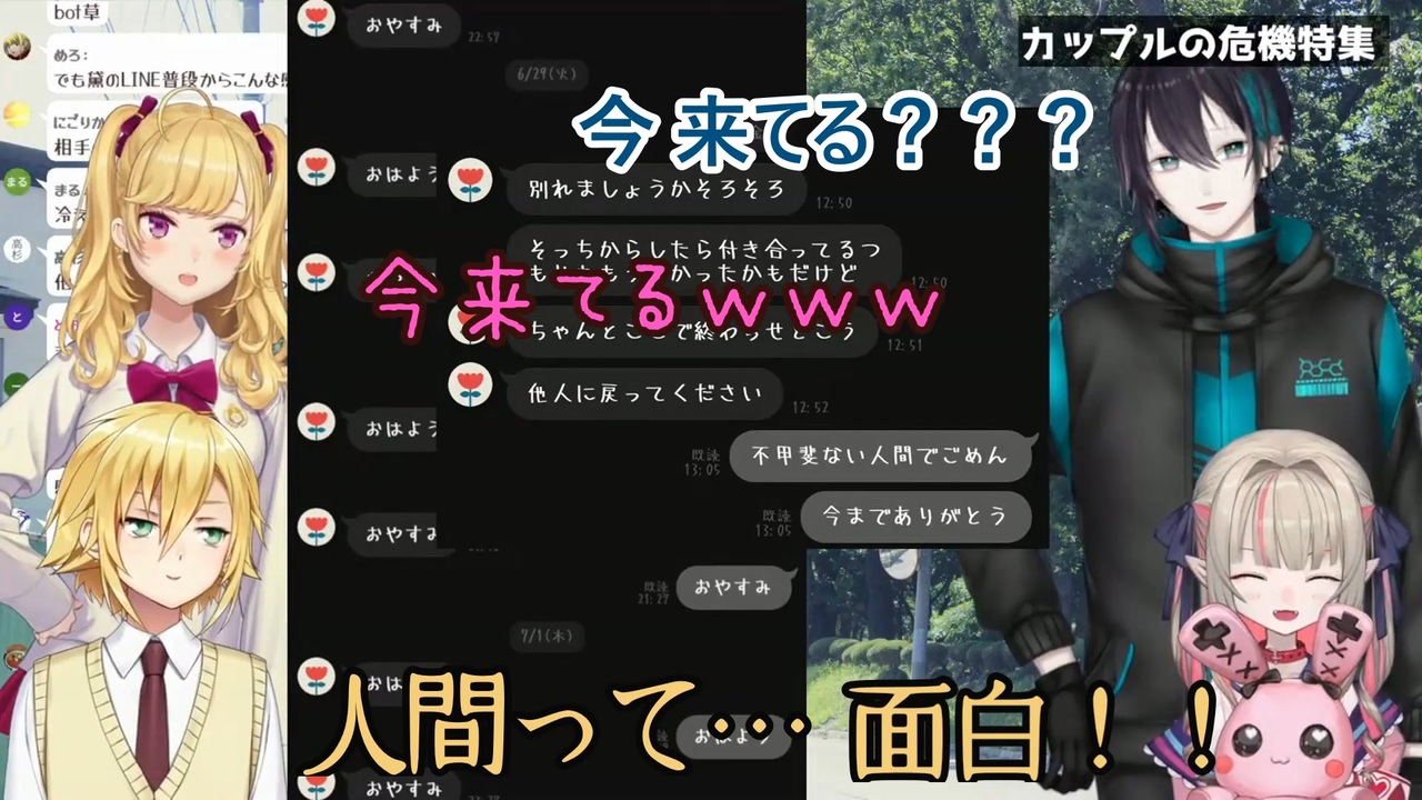 <span style="color: #efefef; font-size: 10px;">卯月コウが黛灰に慣れてきたように感じる<br>とても素晴らしいことではあるが、半年後くらいに関係性リセットされてショックを受ける黛を見たいと思う気持ちも生まれてしまうのもまた仕方のないことである</span><br><br>■元動画<br>【#カップルLINE査定委員会】カップルの危機!LINE選手権【にじさんじ/鷹宮リオン 魔界ノりりむ 卯月コウ 黛灰】<br><a href="https://youtu.be/Kpk9OzambMM" target="_blank" rel="noopener nofollow">https://youtu.be/Kpk9OzambMM</a><br><br>■チャンネル<br>ヤンデレの先導師@鷹宮リオン<br><a href="https://www.youtube.com/channel/UCV5ZZlLjk5MKGg3L0n0vbzw" target="_blank" rel="noopener nofollow">https://www.youtube.com/channel/UCV5ZZlLjk5MKGg3L0n0vbzw</a><br>「恋」に安心しちゃダメだって@魔界ノりりむ <br><a href="https://www.youtube.com/channel/UC9EjSJ8pvxtvPdxLOElv73w" target="_blank" rel="noopener nofollow">https://www.youtube.com/channel/UC9EjSJ8pvxtvPdxLOElv73w</a><br>男の子の気持ちをよくわかってる@卯月コウ <br><a href="https://www.youtube.com/channel/UC3lNFeJiTq6L3UWoz4g1e-A" target="_blank" rel="noopener nofollow">https://www.youtube.com/channel/UC3lNFeJiTq6L3UWoz4g1e-A</a><br>実は乙女心わかってくれてる@黛 灰 / Kai Mayuzumi【にじさんじ】 <br><a href="https://www.youtube.com/channel/UCb5JxV6vKlYVknoJB8TnyYg" target="_blank" rel="noopener nofollow">https://www.youtube.com/channel/UCb5JxV6vKlYVknoJB8TnyYg</a>