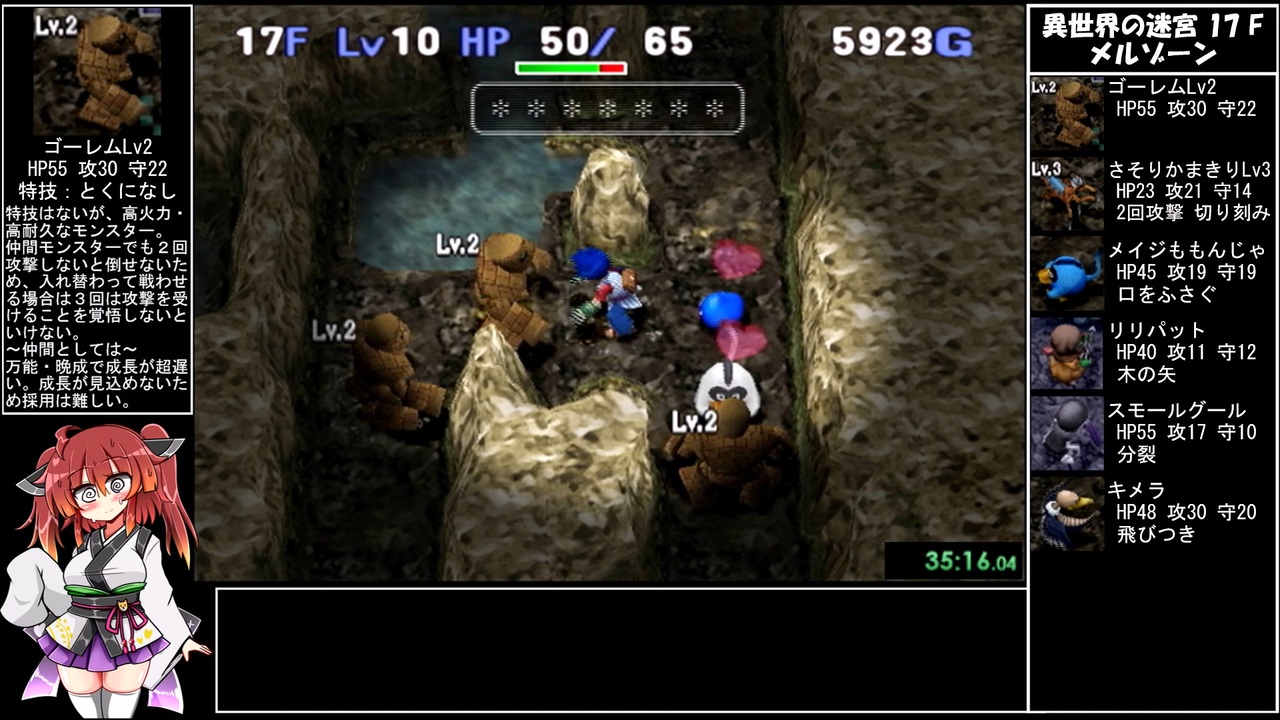 アイテム運良すぎて選別が雑になってる。(呆れ)<br><br>動画の最初と最後に手持ちの仲間・アイテム状況を<br>入れるようにしました。<br><span style="color: #6aa84f;"><strong>※緑字は命名だけ済ませたアイテムです。</strong></span><br><br>お借りした立ち絵:りんどう様 <a href="https://seiga.nicovideo.jp/seiga/im10261811" target="_blank" rel="noopener">im10261811</a><br><br>マイリスト:<a href="https://www.nicovideo.jp/mylist/72099966" target="_blank" rel="noopener">mylist/72099966</a><br><a href="https://www.nicovideo.jp/watch/sm39569572" class="watch">sm39569572</a> ← 前 次→ <a href="https://www.nicovideo.jp/watch/sm39661817" class="watch">sm39661817</a><br><br><span style="color: #ff0000;">【訂正】<br>祝福された弟切草の回復量は100ではなく全回復です。<br>ご指摘ありがとうございます。<br>【もう一つ訂正】<br>サンダーラットの「目くらまし」以外にも<br>「胃下垂・マホトーン・HP減少・HP回復停止・でたらめ・飢餓」<br>の状態異常は仲間の確認と勧誘が可能です。存在を忘れてました。</span>