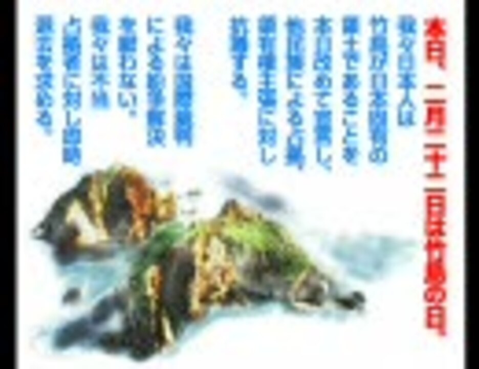 Youtubeではメタル戦士の竹島の歌はすべて抹殺されています。<br>「この動画は、悪意のある表現の禁止に関する YouTube ポリシー違反のため削除されました。<br>悪意のある表現に対する各国での取り組みをご確認ください。」とのこと。<br>なお歌詞は<br>竹島の歌<br><br>詞・曲 メタル戦士<br><br>2月22日は竹島の日<br>日本の領土竹島 日本の竹島<br><br>カッターナイフで指を切り血で声明文を書いても<br>竹島日本の固有の領土<br>炎に包まれもがいてみても<br>竹島日本の固有の領土<br>韓国人が竹島の潮風に吹かれても<br>竹島日本の固有の領土<br>韓国人が韓国内でどれだけアピールしても<br>竹島日本の固有の領土<br><br>脳内領土 脳内領土 ウリナラ脳内領土<br>妄想領土 妄想領土 ウリナラ妄想領土<br>脳内領土 脳内領土 ウリナラ脳内領土<br><br>2月22日は竹島の日<br>日本の領土竹島 日本の竹島<br>2月22日は竹島の日<br>不法侵入者を倒せ 竹島を守れ<br><br>反日アイデンティティー ウリナラ・クオリティー 妄想はエターナティー<br>竹島日本の固有の領土<br>暴走デモクラシー 騒々しい 勘違い甚だしい<br>竹島日本の固有の領土<br><br>ウリナラ・ルール ウリナラ・ルール 俺のものは俺のもの<br>ウリナラ・ルール ウリナラ・ルール お前のものも俺のもの<br>ウリナラ・ルール ウリナラ・ルール ウリナラ妄想ルール<br><br>2月22日は竹島の日<br>日本の領土竹島 日本の竹島<br>2月22日は竹島の日<br>不法侵入者を倒せ 竹島を守れ<br><br>脳内領土 脳内領土 ウリナラ脳内領土<br>妄想領土 妄想領土 ウリナラ妄想領土<br>脳内領土 脳内領土 ウリナラ脳内領土<br><br>2月22日は竹島の日<br>日本の領土竹島 日本の竹島<br>2月22日は竹島の日<br>不法侵入者を倒せ 竹島を守れ<br>2月22日は竹島の日<br>日本の領土竹島 日本の竹島<br><br>ついに外務省が動き出しました\(^o^)/<br><a href="http://www.youtube.com/watch?v=TXg-NGVKuWI" target="_blank" rel="noopener nofollow">http://www.youtube.com/watch?v=TXg-NGVKuWI</a><br><a href="https://www.nicovideo.jp/watch/sm22117479" class="watch">sm22117479</a><br><br>日本の文部科学省は中学校社会科の新学習指導要領の解説書に竹島(韓国名:独島)を日本の「領土」として明記する案を進めている。
