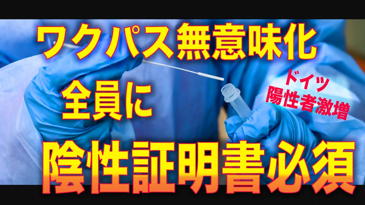 ワクチンパスポート導入しても陽性者が激増したドイツでは、結局、全国に無数の検査場を作って国民全員に陰性証明書を必須とする動きになっています。 <br>なんのための「予防ワクチン」だったのでしょうか?<br>陰性証明書は常に更新が必要で、<br>特定のイベントでは「24時間〜数時間以内」に更新された証明書が必要とされることもあるようです。 <br>イベントに行く前にも検査場で長蛇の列に並ぶのでしょうか?大変ですね...。 <br>ドイツでの陽性テスト無料化のお知らせ <a href="https://www.morgenpost.de/vermischtes/article233832013/corona-deutschland-test-kostenlos-apotheke-testzentrum.html" target="_blank" rel="noopener nofollow">https://www.morgenpost.de/vermischtes/article233832013/corona-deutschland-test-kostenlos-apotheke-testzentrum.html</a><br><br>ヤフーニュース(ネタ元BBC)では「ドイツの多くの地域では接種完了者にのみ、バーやカフェ、美容院、ジムなどほとんどのサービスの利用が認められている」となっていますが、それは古い話で現在は接種完了していても陰性証明が必要とされる流れです。<br><a href="https://news.yahoo.co.jp/articles/9a46c42d292350119289a0374cc375a941333302" target="_blank" rel="noopener nofollow">https://news.yahoo.co.jp/articles/9a46c42d292350119289a0374cc375a941333302</a><br>陰性証明証がなければ市民生活が出来なくなるという不安は現地の友人から直接聞きましたので確かな情報です。<br>接種完了者は安全という神話はすでに崩壊しています。<br><br>ワクチンは感染予防ではなく、重症化予防のためなどというのは馬鹿げたゴマカシです。<br>その言葉どおりに重症化しないのなら感染しても怖くないわけで、それなのにこの大騒ぎはなんでしょうか?<br>理性で考えればヘンな話だと気づくでしょう。<br><br>誰が何のためにワクチンを推しているのかなどはあとで考えればいいことです。<br>いまは<br>ワクチン接種にメリットは無く、あるのはデメリットだということに気がつくことが最重要です。<br><br>Twitterです。ツイートします。万一のためにフォローお願いします。 <a href="https://twitter.com/Kuromori_Mineo" target="_blank" rel="noopener nofollow">https://twitter.com/Kuromori_Mineo</a> <br>黒森のブログです。万一のためにブックマークお願いします。 <a href="http://kuromorimineo.com/" target="_blank" rel="noopener nofollow">http://kuromorimineo.com/</a> <br>ご意見ご希望はこちらから <a href="http://kuromorimineo.com/contact/" target="_blank" rel="noopener nofollow">http://kuromorimineo.com/contact/</a> <br>BGM : MusMus