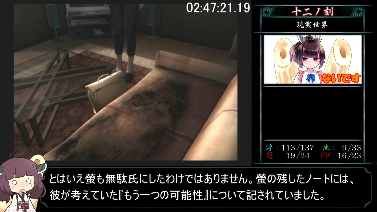 お待たせ!(動画内容が)物集めしかなかったけどいいかな?(作業)<br>次回から毎週投稿ペースに戻せたらいいなと思っています(希望的観測)<br><br>~追記1~<br><a href="#" class="seekTime" data-seekTime="12:26" onclick="seekNicoPlayer('#12:26'); return false;">#12:26</a><br>「見てしまった」の部分、今聞いてみると確かに「来てしまった」だなと思うんですが、<br>ストーリーや設定的には「見てしまった」のほうが合ってると思うんですけど(凡推理)<br><br>~追記2~<br><a href="#" class="seekTime" data-seekTime="18:48" onclick="seekNicoPlayer('#18:48'); return false;">#18:48</a><br>ラスボスの即氏攻撃を喰らったのは2周目だったので、<br>鏡石カットで露と消えた時間は6時間半です(全ギレ)<br><br>十二ノ刻開始~十三ノ刻終了まで<br><br><a href="https://www.nicovideo.jp/watch/sm39558545" class="watch">sm39558545</a>←前|<a href="https://www.nicovideo.jp/mylist/71775161" target="_blank" rel="noopener">mylist/71775161</a>|次→<a href="https://www.nicovideo.jp/watch/sm39677179" class="watch">sm39677179</a><br><br>RTA part1集 <a href="https://www.nicovideo.jp/mylist/71936684" target="_blank" rel="noopener">mylist/71936684</a><br><br><strong><u>▼参考サイト様等</u></strong><br>・攻略フルーツ - 零 刺青の聲 - <a href="https://xn--cool-kk4csd1lrc8dvi.xyz/zero-koe/" target="_blank" rel="noopener nofollow">https://xn--cool-kk4csd1lrc8dvi.xyz/zero-koe/</a><br>・零~刺青ノ聲~ 公式完全攻略本 導魂之書 - 株式会社エンターブレイン<br><br><strong><u>▼お借りした素材達</u></strong><br>・【akihiyo様】:立ち東北きりたん素材 - <a href="https://seiga.nicovideo.jp/seiga/im10601764" target="_blank" rel="noopener">im10601764</a><br>・【公式様】:東北ずん子のイラスト/3Dデータ - <a href="https://zunko.jp/con_illust.html" target="_blank" rel="noopener nofollow">https://zunko.jp/con_illust.html</a><br><br><strong><u>▼プレイ環境</u></strong><br>・本体(実機):SCPH-30000<br>・コントローラ:SCPH-10010<br>・ディスク:廉価版のやつ<br><br><strong><u>▼レギュレーション/縛り等</u></strong><br>・計測開始:1周目開始時New GameからNormalを選択した瞬間<br>・計測終了:2周目終了時リザルト画面にて「霊リスト:217/217」が表示された瞬間<br>・難易度は2周ともNormal<br>・エンディングは2周ともノーマルエンド<br>・バグ技はなんでもあり