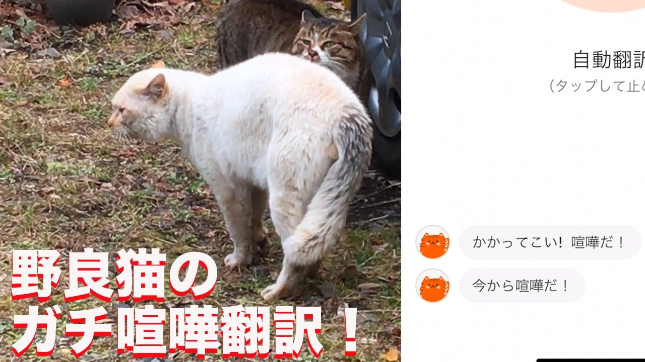 元になった動画 <a href="https://www.nicovideo.jp/watch/sm38268403" class="watch">sm38268403</a><br><br>我が家の猫たちで試したみてそこそこ合ってた猫語翻訳アプリの「にゃんトーク」。<br>そこで、本当の野良猫の鳴き声はどうかと思い、過去動画で自分が使用したガチ野良猫喧嘩音声プラスアルファで猫語翻訳を検証してみました。<br><br>簡単な登場猫紹介 <a href="http://blog.livedoor.jp/nekokamasu/archives/56241249.html" target="_blank" rel="noopener nofollow">http://blog.livedoor.jp/nekokamasu/archives/56241249.html</a><br>よくあるご質問 <a href="http://blog.livedoor.jp/nekokamasu/archives/57126148.html" target="_blank" rel="noopener nofollow">http://blog.livedoor.jp/nekokamasu/archives/57126148.html</a><br>ブログ <a href="http://blog.livedoor.jp/nekokamasu/" target="_blank" rel="noopener nofollow">http://blog.livedoor.jp/nekokamasu/</a><br><br>