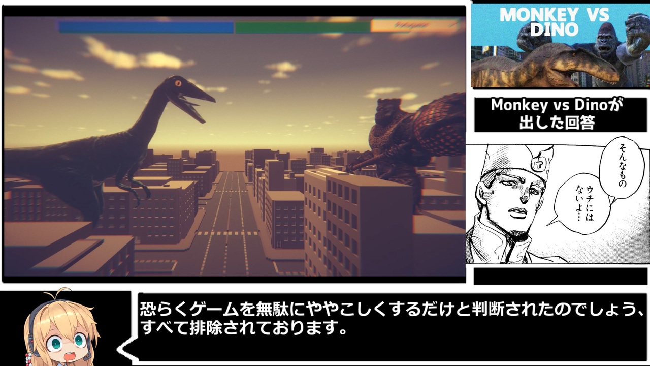 RTAのタァイムが動画時間の一割にも満たなくて草<br> <br>・走ることに意義があるって、それ一番言われてるから<br>・RTA10作目だって、すごいわね。(こんなんでいいのかよ)<br>・見た目に惑わされないで、ゲームの感触は自分でやってみてこそよ<br> <br>←前回のRTA(ではない紹介動画):<a href="https://www.nicovideo.jp/watch/sm38807358" class="watch">sm38807358</a><br>→次回のRTA(EPIC KNIGHT):<a href="https://www.nicovideo.jp/watch/sm45467232" class="watch">sm45467232</a><br> <br><レギュレーション><br>・1ラウンド勝利までのタイムを競う(ダブルKOによる引き分けは不可)<br>・キャラクターはDino使用<br>・計測開始地点はDinoを選択し操作可能になった瞬間<br>・計測終了地点は「You Win!」が表示された瞬間 <br> <br>RTAは <a href="#" class="seekTime" data-seekTime="9:55" onclick="seekNicoPlayer('#9:55'); return false;">#9:55</a> くらいから<br>無編集版はつべにアップロード済み:<a href="https://www.youtube.com/watch?v=-ZEXwpP3-jQ" target="_blank" rel="noopener nofollow">https://www.youtube.com/watch?v=-ZEXwpP3-jQ</a><br> <br>◆駄菓子ゲーの情報共有および交流を目的としたSteamグループを作成しております。<br>( <a href="https://steamcommunity.com/groups/dagashi_100yen" target="_blank" rel="noopener nofollow">https://steamcommunity.com/groups/dagashi_100yen</a> )<br>まあ別に駄菓子ゲーじゃなくても琴線に触れたゲームなら紹介していいんですけどね、初見さん<br>◆本ゲームのご購入はこちらから→<a href="https://store.steampowered.com/app/1588140/Monkey_vs_Dino/?l=japanese" target="_blank" rel="noopener nofollow">https://store.steampowered.com/app/1588140/Monkey_vs_Dino/?l=japanese</a><br>◆合成音声クレジット<br>・VOICEROID+ 民安ともえ EX<br>・A.I.VOICE 琴葉葵<br>・VOICEVOX ずんだもん<br>