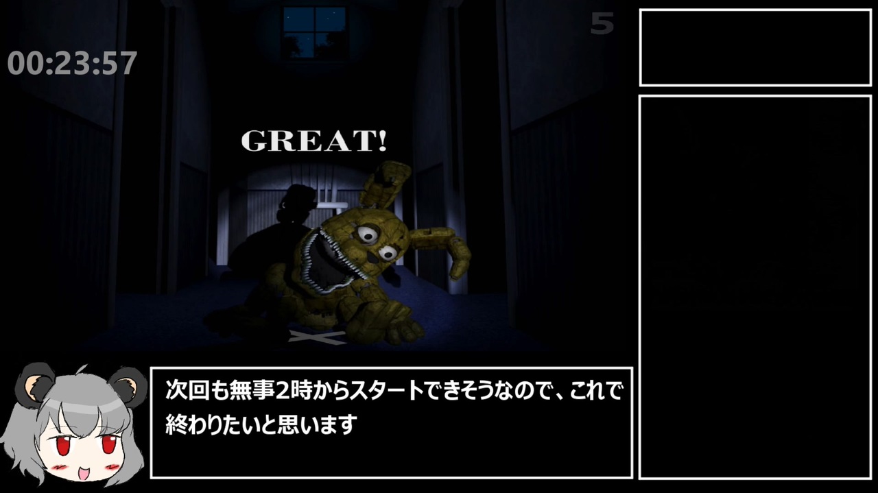 音声がキャプチャーできていなかったので今回のおまけはないです。なので今回はめちゃくちゃ短いです。<br>Five Nights at Freddy's4通称FNAF4のany%RTAのpart3です。<br><br><a href="https://www.nicovideo.jp/watch/sm39613297" class="watch">sm39613297</a> ←前回 次回→ <a href="https://www.nicovideo.jp/watch/sm39707885" class="watch">sm39707885</a><br><br />FNAF RTAマイリスト <a href="https://www.nicovideo.jp/mylist/71729876" target="_blank" rel="noopener">mylist/71729876</a><br>参考にさせていただいているWiki様→<a href="https://fnaf.swiki.jp/" target="_blank" rel="noopener nofollow">https://fnaf.swiki.jp/</a><br>Twitter→ <a href="https://twitter.com/shilviass" target="_blank" rel="noopener nofollow">https://twitter.com/shilviass</a><br>youtube→<a href="https://www.youtube.com/channel/UCmOIEb76TtHFbBYzMRQpAUQ" target="_blank" rel="noopener nofollow">https://www.youtube.com/channel/UCmOIEb76TtHFbBYzMRQpAUQ</a>