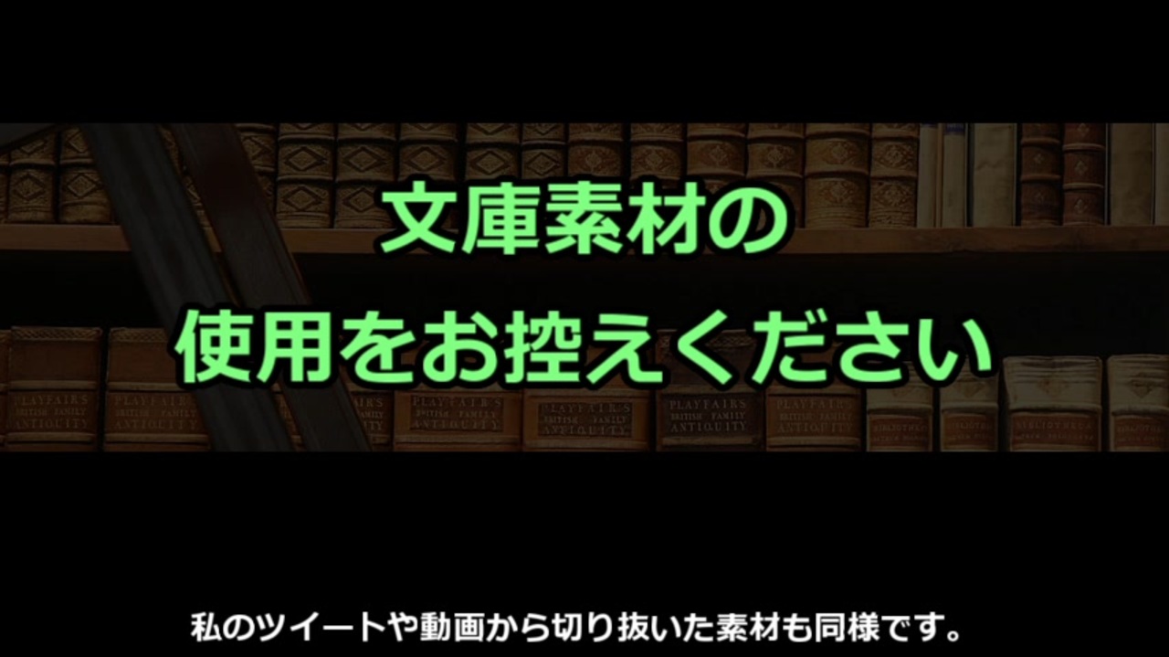 104x ゆっくり文庫による素材配布は停止しました。<br>コモンズから取得した改変素材、および私のツイート、動画から切り取った素材は、今後、使用をお控えください。<br>皆様に御迷惑をおかけして、誠に申し訳ございませんでした。<br>ゆっくり文庫<br><br>きつねゆっくり利用規約。<br><a href="https://kitsunekakko.fanbox.cc/posts/2718822" target="_blank" rel="noopener nofollow">https://kitsunekakko.fanbox.cc/posts/2718822</a><br><br>※この動画にコメントしないようお願いいたします。