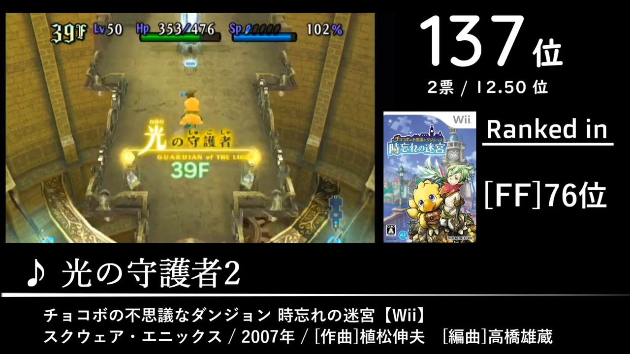 2021年10月1日~2021年10月30日にかけて行われた「第2回みんなで掘り出すゲーム音楽ベスト100」の結果を動画化したものです。 <span style="font-size: 10px;">集計人≠動画制作者</span><br>Part.3では144位から129位までの20曲を収録しています。<br><br>↓全体の結果はこちら↓<br><a href="https://w.atwiki.jp/gamemusicbest100/pages/9658.html" target="_blank" rel="noopener nofollow">https://w.atwiki.jp/gamemusicbest100/pages/9658.html</a><br><br>【投票者コメントについて】<br>原則としてすべてのコメントを掲載するつもりですが、集計人さんへの伝達事項、「○○枠その1」など前後の文脈ありきのコメント、ランキングのネタバレになり得るコメントなど、一部のものは独断で省略させていただくことがあります。ご了承ください。<br><br>Part.2→<a href="https://www.nicovideo.jp/watch/sm39616567" class="watch">sm39616567</a><br>Part.4→<a href="https://www.nicovideo.jp/watch/sm39676339" class="watch">sm39676339</a><br><br>第2回掘り出しまとめ→<a href="https://www.nicovideo.jp/mylist/72129488" target="_blank" rel="noopener">mylist/72129488</a><br>