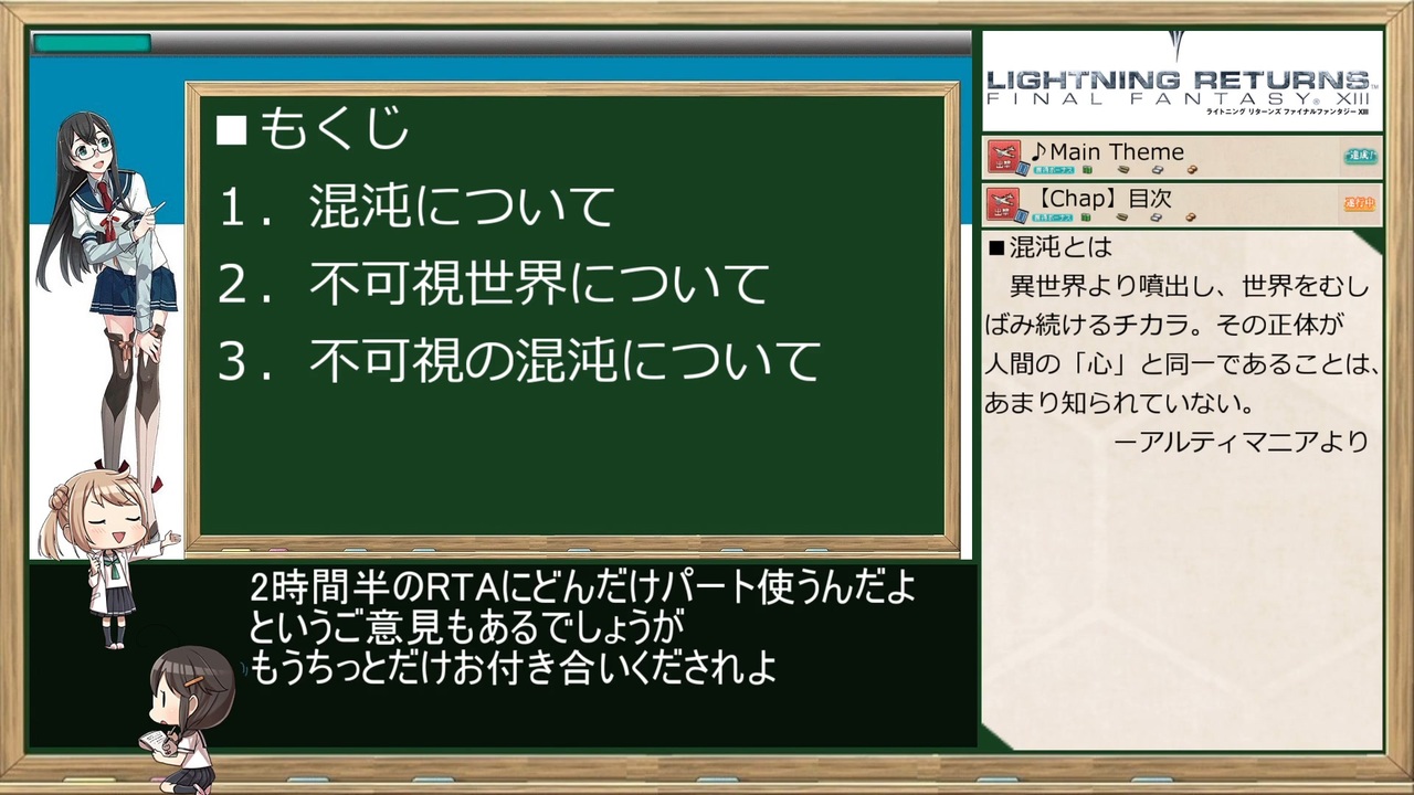幕間の解説回です。<br>RTAが全く進まないんですがそれは<br><br>【GAME】 <br>LIGHTNING RETURNS FINAL FANTASYⅩⅢ<br>(ライトニングリターンズファイナルファンタジー13)<br>Steam(PC版)<br><br>【レギュレーション】<br>・計測区間:ゲームスタート選択~ラスボス撃破後リザルト表示<br>・難易度:ノーマル<br>・DLC使用不可<br>・オンライン要素使用不可<br><br>【<a href="https://www.nicovideo.jp/mylist/71610934" target="_blank" rel="noopener">mylist/71610934</a>】 <br>PREV≫<a href="https://www.nicovideo.jp/watch/sm39620757" class="watch">sm39620757</a><br>NEXT≫<a href="https://www.nicovideo.jp/watch/sm39678966" class="watch">sm39678966</a><br><br>Part.1≫<a href="https://www.nicovideo.jp/watch/sm39215131" class="watch">sm39215131</a><br><br>ファブラノヴァ神話&これまでのあらすじ≫<a href="https://www.nicovideo.jp/watch/sm39205369" class="watch">sm39205369</a><br><br>≪前作RTA≫Bullet Girls Phantasia RTA_3:16:45_Part.1<br>≫<a href="https://www.nicovideo.jp/watch/sm38304057" class="watch">sm38304057</a><br><br>≪ウマ娘RTAもやってます≫トレーナーID:530 912 477<br>≫<a href="https://www.nicovideo.jp/watch/sm38417256" class="watch">sm38417256</a><br><br>Other Cielo’s Title <br>【<a href="https://www.nicovideo.jp/mylist/50418741" target="_blank" rel="noopener">mylist/50418741</a> 】<br><br>twitter <a href="https://twitter.com/Cielo_Polo" target="_blank" rel="noopener nofollow">https://twitter.com/Cielo_Polo</a><br>