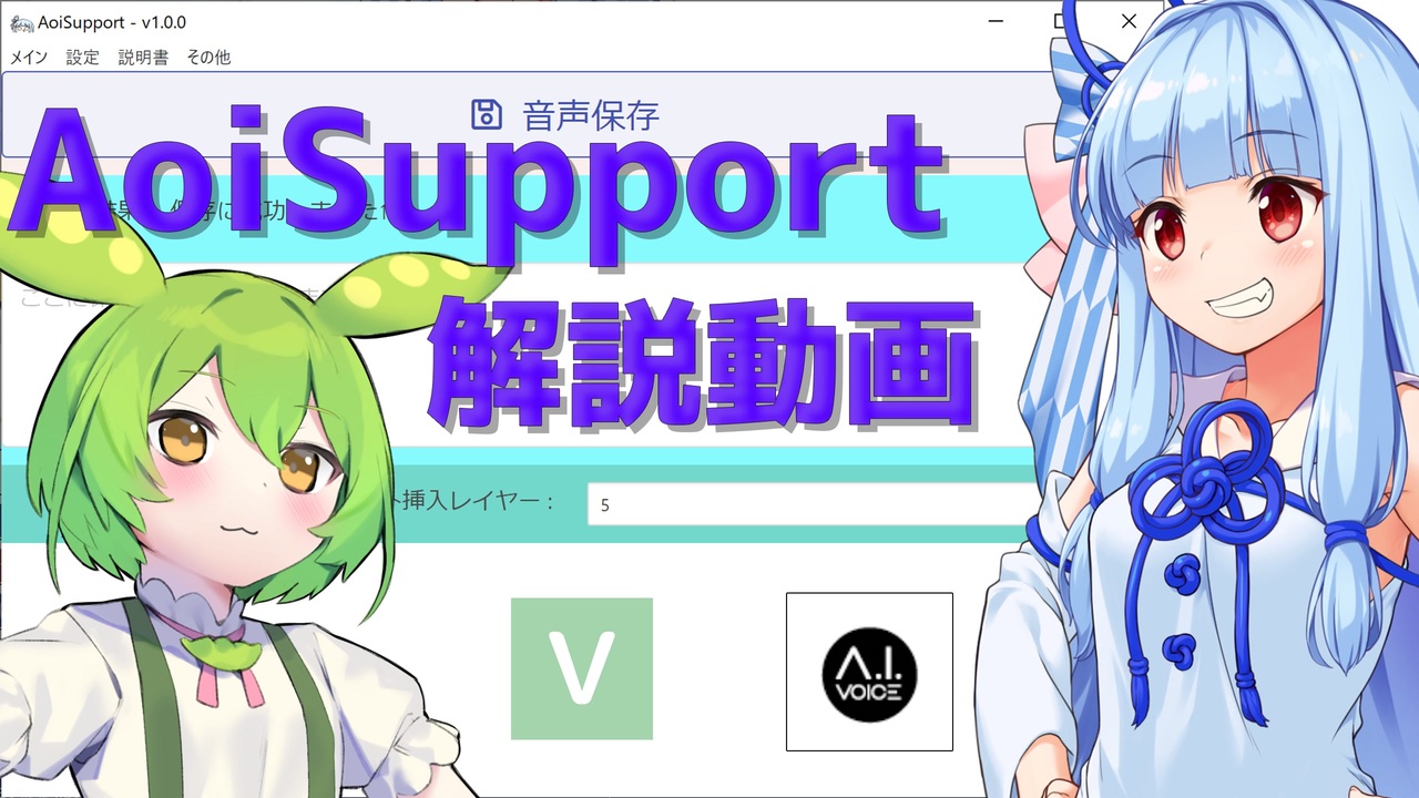 音声合成ソフトを利用した動画制作支援ツールであるAoiSupportの導入方法を解説した動画です!<br>AoiSupportの概要を説明した動画もあるので、そちらもご参照ください。(<a href="https://www.nicovideo.jp/watch/sm39661703" class="watch">sm39661703</a>)<br><br>↓ツール本体の配布場所及び説明書はこちらです↓<br><a href="https://aoi-chan.moe/aoisupport/" target="_blank" rel="noopener nofollow">https://aoi-chan.moe/aoisupport/</a><br><br>↓Mac版はこちら↓<br><a href="https://aoi-chan.moe/aoisupport-mac/" target="_blank" rel="noopener nofollow">https://aoi-chan.moe/aoisupport-mac/</a><br><br>目次は以下です。数字をクリックするとその解説場所までシークできます。<br><a href="#" class="seekTime" data-seekTime="00:08" onclick="seekNicoPlayer('#00:08'); return false;">#00:08</a> はじめのあいさつ<br><a href="#" class="seekTime" data-seekTime="00:37" onclick="seekNicoPlayer('#00:37'); return false;">#00:37</a> AoiSupport本体設定<br><a href="#" class="seekTime" data-seekTime="02:02" onclick="seekNicoPlayer('#02:02'); return false;">#02:02</a> AviUtl設定<br><a href="#" class="seekTime" data-seekTime="03:51" onclick="seekNicoPlayer('#03:51'); return false;">#03:51</a> A.I.VOICE、VOICEROID2設定<br><a href="#" class="seekTime" data-seekTime="11:02" onclick="seekNicoPlayer('#11:02'); return false;">#11:02</a> VOICEVOX設定<br><a href="#" class="seekTime" data-seekTime="13:44" onclick="seekNicoPlayer('#13:44'); return false;">#13:44</a> 削除・置換機能紹介<br><a href="#" class="seekTime" data-seekTime="14:35" onclick="seekNicoPlayer('#14:35'); return false;">#14:35</a> YMM4設定<br><a href="#" class="seekTime" data-seekTime="16:16" onclick="seekNicoPlayer('#16:16'); return false;">#16:16</a> 今後のアップデート予定<br><a href="#" class="seekTime" data-seekTime="17:53" onclick="seekNicoPlayer('#17:53'); return false;">#17:53</a> 終わりのあいさつ<br><br>AoiSupportはPSDToolKitに強く依存しています。必要に応じてPSDToolKitの制作者様のチュートリアルもご参照ください。<br><a href="https://oov.github.io/aviutl_psdtoolkit/tutorial.html" target="_blank" rel="noopener nofollow">https://oov.github.io/aviutl_psdtoolkit/tutorial.html</a><br><br>うまく動かない場合は下記まで連絡いただけると幸いです。<br>Twitter:<a href="https://twitter.com/Mrs_NeedleMouse" target="_blank" rel="noopener nofollow">https://twitter.com/Mrs_NeedleMouse</a><br>ブログ:<a href="https://aoi-chan.moe" target="_blank" rel="noopener nofollow">https://aoi-chan.moe</a><br><br><br>A.I.VOICEの命名規則の推奨文字<br>{yyyyMMdd}-{HHmmss}-{Number}-{VoicePreset}-{Text}<br><br>この動画は以下のソフト、キャラクターを使用しております。<br>A.I.VOICE:琴葉葵<br>A.I.VOICE:結月ゆかり(雫)<br>VOICEVOX:ずんだもん:<a href="https://voicevox.hiroshiba.jp/" target="_blank" rel="noopener nofollow">https://voicevox.hiroshiba.jp/</a><br><br>追記1:ガイノイドTalkはVOICEROID2と設定内容が同じなので、VOICEROID2設定をご参照ください<br>追記2:COEIROINKはVOICEVOXと設定内容が同じなので、VOICEVOX設定をご参照ください<br>追記3:CeVIO AI、CeVIO CS、VOICEPEAK等、その他のソフトの解説はしていませんので、説明書の方をご参照ください<br>追記4:Mac版の仕様はほぼ同じですが、本動画はAviUtl、YMM4等の解説が中心となり、これらのソフトはMacに対応していないので説明書の方をご参照ください。