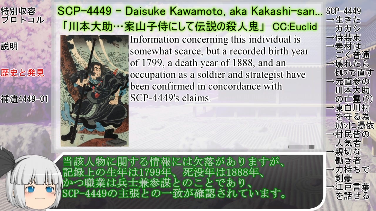 朗読中、しれっと「みょん」と言う箇所が3回あるので探してみてください。<br><br>記事概要→<a href="#" class="seekTime" data-seekTime="1:20" onclick="seekNicoPlayer('#1:20'); return false;">#1:20</a> 特別収容プロトコル→<a href="#" class="seekTime" data-seekTime="2:47" onclick="seekNicoPlayer('#2:47'); return false;">#2:47</a><br>説明→<a href="#" class="seekTime" data-seekTime="3:45" onclick="seekNicoPlayer('#3:45'); return false;">#3:45</a> 発見と歴史→<a href="#" class="seekTime" data-seekTime="9:32" onclick="seekNicoPlayer('#9:32'); return false;">#9:32</a> 補遺→<a href="#" class="seekTime" data-seekTime="18:02" onclick="seekNicoPlayer('#18:02'); return false;">#18:02</a><br><br>[登場するSCP記事]<br>・SCP Foundation<br>SCP-4449 著:CadaverCommander様 <a href="https://scp-wiki.wikidot.com/scp-4449" target="_blank" rel="noopener nofollow">https://scp-wiki.wikidot.com/scp-4449</a><br>CadaverCommanderの機動強襲大墳墓 著:CadaverCommander様 訳:islandsmaster様 <a href="http://scp-jp.wikidot.com/cadavercommander" target="_blank" rel="noopener nofollow">http://scp-jp.wikidot.com/cadavercommander</a><br><br><br>[マイリスト→ <a href="https://www.nicovideo.jp/mylist/60641229" target="_blank" rel="noopener">mylist/60641229</a>]<br><span style="font-size: 13px;">[vol.1→ <a href="https://www.nicovideo.jp/watch/sm32480140" class="watch">sm32480140</a>]</span><br />Twitter→<a href="https://twitter.com/thor_taisho" target="_blank" rel="noopener nofollow">https://twitter.com/thor_taisho</a> (@thor_taisho)<br>YouTube→<a href="https://www.youtube.com/channel/UCT5Hb7pWYChe4vQK85cJDTg" target="_blank" rel="noopener nofollow">https://www.youtube.com/channel/UCT5Hb7pWYChe4vQK85cJDTg</a><br><br>サポーター登録はこちら!→<a href="https://creator-support.nicovideo.jp/registration/73985180" target="_blank" rel="noopener nofollow">https://creator-support.nicovideo.jp/registration/73985180</a>