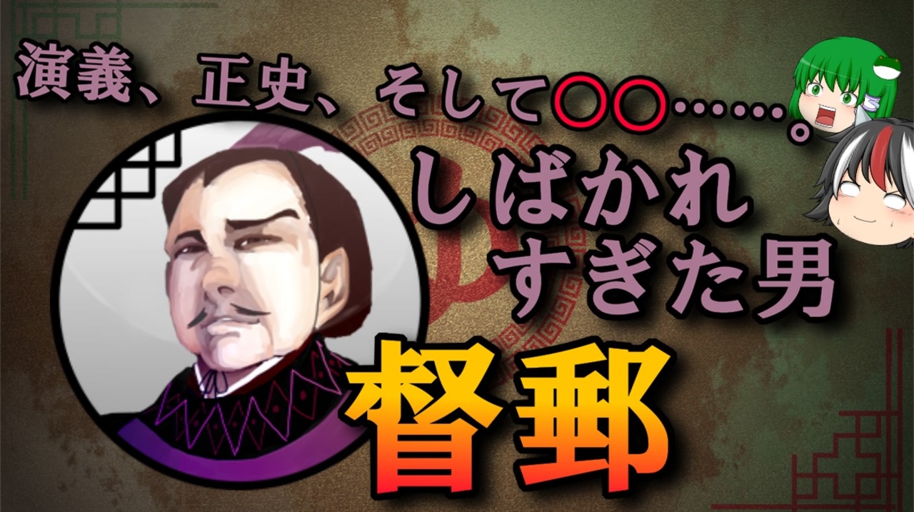 この動画は東方projectの二次創作です。AquesTalkライセンス購入済み。<br> <br>◇反三国志二次創作同人誌「叔漢二國史」<a href="https://danxiawangchao.booth.pm/items/2029329" target="_blank" rel="noopener nofollow">https://danxiawangchao.booth.pm/items/2029329</a><br><br>三国志のメジャーではないけれど面白い人物や評価されるべき人物を紹介していきます。<br>督郵といえば、太守に所属して各県の役人の働きぶりを監査する官職の名前ですが、この官名を聞いて三国志に少しでも触れたことのある方なら、ほとんどの人が共通する人物を思い浮かべる事でしょう。<br>今回はそういう、おそらく三国志において最も有名な督郵について解説し、この他にも悲惨な目にあった督郵や、督郵を経験した人物たちについても触れていきます。<br><br>▷第四十三回「短編集2」<a href="https://www.nicovideo.jp/watch/sm39555696" class="watch">sm39555696</a><br>▷第四十五回「趙浮」<a href="https://www.nicovideo.jp/watch/sm39766876" class="watch">sm39766876</a><br><br>◆◆◆◆◆◆◆◆◆◆◆◆◆◆◆◆◆◆◆◆◆◆◆<br>参考文献、補足など<br>亶夏王朝府 <a href="https://danxiawangchao.hatenablog.com/" target="_blank" rel="noopener nofollow">https://danxiawangchao.hatenablog.com/</a><br>この動画の参考文献 <a href="https://danxiawangchao.hatenablog.com/entry/2021/11/25/014858" target="_blank" rel="noopener nofollow">https://danxiawangchao.hatenablog.com/entry/2021/11/25/014858</a><br><br>この動画のイラストまとめ<br>Pixiv <a href="https://www.pixiv.net/artworks/94356144" target="_blank" rel="noopener nofollow">https://www.pixiv.net/artworks/94356144</a><br>ニコニコ静画 <a href="https://seiga.nicovideo.jp/seiga/im10854867" target="_blank" rel="noopener">im10854867</a><br>BOOTH <a href="https://danxiawangchao.booth.pm/items/3455063" target="_blank" rel="noopener nofollow">https://danxiawangchao.booth.pm/items/3455063</a><br><br>YouTubeにもアップロードしています。よろしければ評価、チャンネル登録よろしくお願いします。<br><a href="https://youtu.be/2DGtqpiZVUo" target="_blank" rel="noopener nofollow">https://youtu.be/2DGtqpiZVUo</a><br>◆◆◆◆◆◆◆◆◆◆◆◆◆◆◆◆◆◆◆◆◆◆◆<br><br>音楽効果音提供<br>チンドン演歌/稿屋 隆 様<br>ミスト/甘茶の音楽工房 様<br>イベント12/魔王魂 様<br>イベント27/魔王魂 様<br>あーもうめちゃくちゃ!/ハモおた 様<br>Taiko Warrior/MFP【Marron Fields Production】様<br>Manhattan/A.TARUI 様<br>