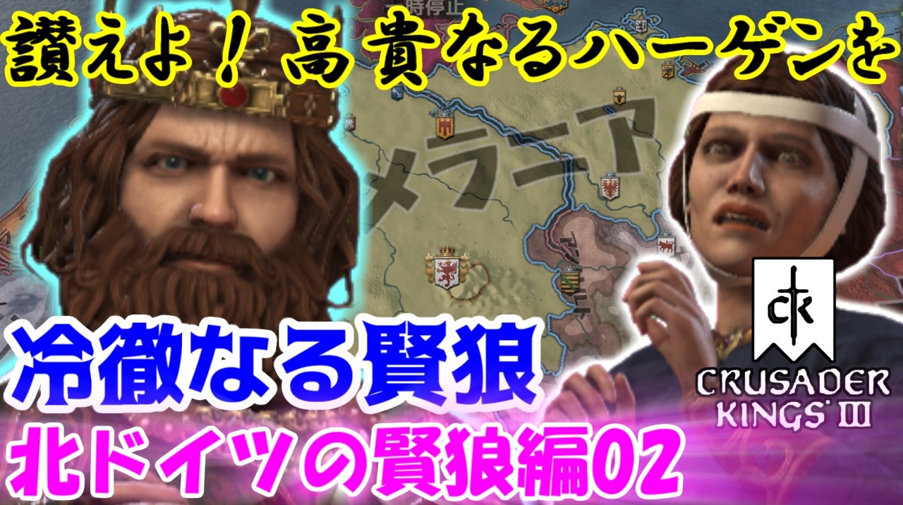 3か月ぶりか…大変お待たせ致しました(焼き土下座)<br><br>母の宿敵であったマグヌスの息子たちを次々と打ち倒し、ポメラニアの領土は拡大していく。だが、反乱、疫病と次々に災難は降りかかる。<br>(今回の動画のタイムライン:1102年8月17日~1107年12月16日)<br><br>この動画はCK3のプレイを基にしたフィクションです。原作(史実)とキャラが違うことがままあります。<br><br><strong>いつも多額の広告をして頂き、ありがとうございます。</strong><br><span style="color: #ff0000;"><strong>このゲームの詳しい遊び方を知りたい人は:</strong></span><br>ぽりぽりさん:<a href="https://www.nicovideo.jp/watch/sm37478750" class="watch">sm37478750</a><br>ゆらんこさん:<a href="https://www.nicovideo.jp/watch/sm38162125" class="watch">sm38162125</a><br>つー助教授:<a href="https://www.nicovideo.jp/watch/sm38508368" class="watch">sm38508368</a><br><br>ガチ保守の人のゲーム実況1話リンク:<a href="https://www.nicovideo.jp/mylist/53413022" target="_blank" rel="noopener">mylist/53413022</a> <br>前:<a href="https://www.nicovideo.jp/watch/sm39164676" class="watch">sm39164676</a> <a href="https://www.nicovideo.jp/mylist/70176653" target="_blank" rel="noopener">mylist/70176653</a> 次:(まだ)ないです<br>讃えよ!高貴なるハーゲンを!シリーズリスト:<a href="https://www.nicovideo.jp/series/185762" target="_blank" rel="noopener">series/185762</a><br><br>【状況説明】<br>ゲーム開始年月日:1066年9月15日<br>プレイ国家:神聖ローマ帝国諸侯アングリア公爵領内のゲッティンゲン伯爵<br><br>導入DLC<br>主要DLCすべて<br><br>導入MOD<br>Japanese Language Mod<br>Japanese Font Alternative<br>Fullscreen Barbershop<br><br>日本語MODは <a href="https://paradoxian-japan-mod.com/" target="_blank" rel="noopener nofollow">https://paradoxian-japan-mod.com/</a><br>のものを使わせていただいております。<br><br>次回予告曲:【無料フリーBGM】中世の切ない古楽・オーケストラ・ハープ「Minstrel2」<br><a href="https://youtu.be/FLCe8BZRIOM" target="_blank" rel="noopener nofollow">https://youtu.be/FLCe8BZRIOM</a><br><br>進捗はバカッターにてお知らせしています:<a href="https://twitter.com/Kagami_Shusetsu" target="_blank" rel="noopener nofollow">https://twitter.com/Kagami_Shusetsu</a>