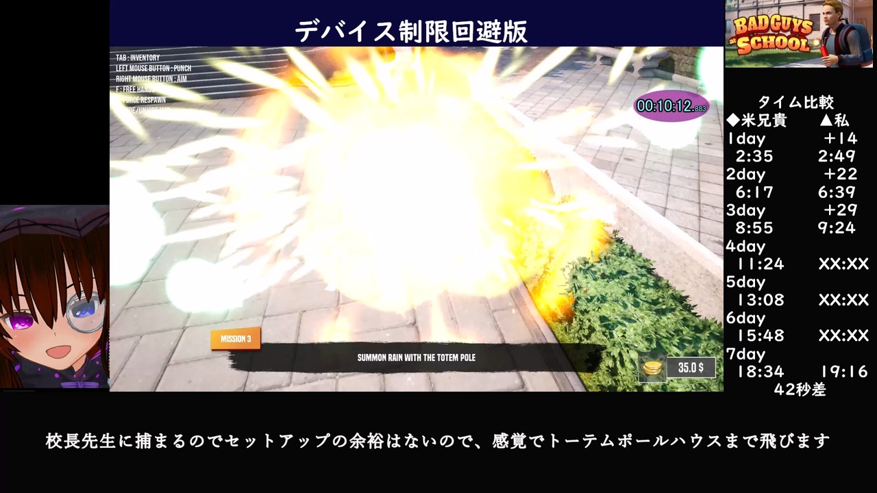 <span style="font-size: 24px;"><a href="https://www.nicovideo.jp/watch/sm39670870" class="watch">sm39670870</a> のデバイス制限回避版です</span><br>日本1位です<br><span style="font-size: 18px;"><u>デバイス制限回避版のため、酔い止め等一切ないのでご注意ください。</u></span> <br>解説してる内容は全部一緒です。 <br><br><strong><u>レギュレーション(</u></strong><strong>All Missions</strong><strong><u>)<br>1日目開始時(左上ヘルプ項目が出た瞬間)~7日目5つ目の弓矢が当たった瞬間<br>(Speedrun.com基準)</u></strong><br><br>無編集版(You Tube)→<a href="https://youtu.be/IG4krKKvCnM" target="_blank" rel="noopener nofollow">https://youtu.be/IG4krKKvCnM</a><br><br>全RTAマイリス⇒<a href="https://www.nicovideo.jp/mylist/69428960" target="_blank" rel="noopener">mylist/69428960</a><br>バッドガイズ専用マイリス→<a href="https://www.nicovideo.jp/mylist/70534608" target="_blank" rel="noopener">mylist/70534608</a>