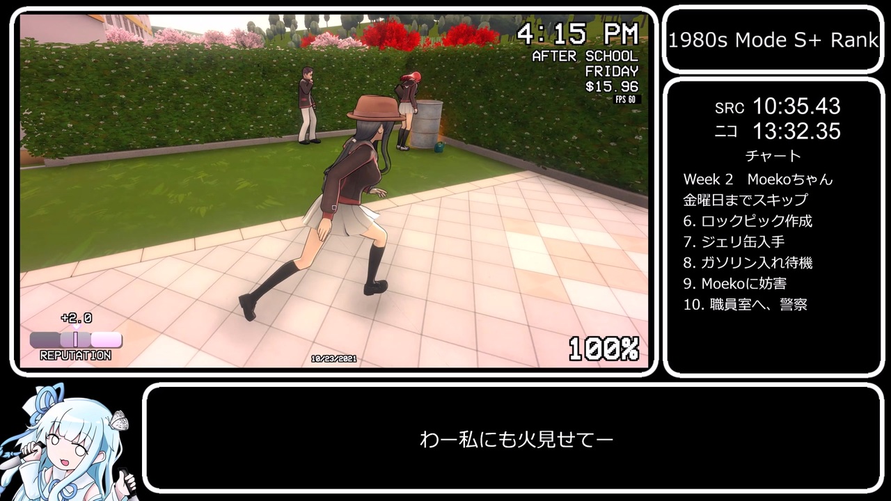 編集が遅すぎるんだよね。それ一番言われてるから初投稿です。<br>A.I.VOICEを使用しています。ご了承ください。<br>引き続き1980年モードのRTAです。長いので2パートに分けました。<br>本編は <a href="#" class="seekTime" data-seekTime="1:28" onclick="seekNicoPlayer('#1:28'); return false;">#1:28</a> から始まります。<br><br><strong><u>レギュレーション<br>1980年モードをS+ランクでクリア<br>計測区間:空ファイル選択~エンディング開始まで<br>Speedrun仕様(SRC)…ロード時間は計測しない<br>ニコニコ仕様…ロード時間も計測</u></strong><br><br>Speedrun仕様のタイマー付けただけ版→<a href="https://youtu.be/hUvey3s5Uks" target="_blank" rel="noopener nofollow">https://youtu.be/hUvey3s5Uks</a><br><br>σ軸兄貴のS+RTA→<a href="https://www.nicovideo.jp/watch/sm39551379" class="watch">sm39551379</a><br><br>1980年モードのランクの仕様について(公式サイト)→<a href="https://yanderesimulator.com/s-rank/" target="_blank" rel="noopener nofollow">https://yanderesimulator.com/s-rank/</a><br><br>前→<a href="https://www.nicovideo.jp/watch/sm39601274" class="watch">sm39601274</a><br>次→<a href="https://www.nicovideo.jp/watch/sm39740319" class="watch">sm39740319</a><br>RTAマイリス→<a href="https://www.nicovideo.jp/mylist/74656323" target="_blank" rel="noopener">mylist/74656323</a><br><br><strong>かわいい立ち絵を描いてくださったチカ兄貴→<a href="https://www.nicovideo.jp/user/116945047" target="_blank" rel="noopener">user/116945047</a></strong><br>その他お借りした素材はコンテンツツリーをご覧ください。