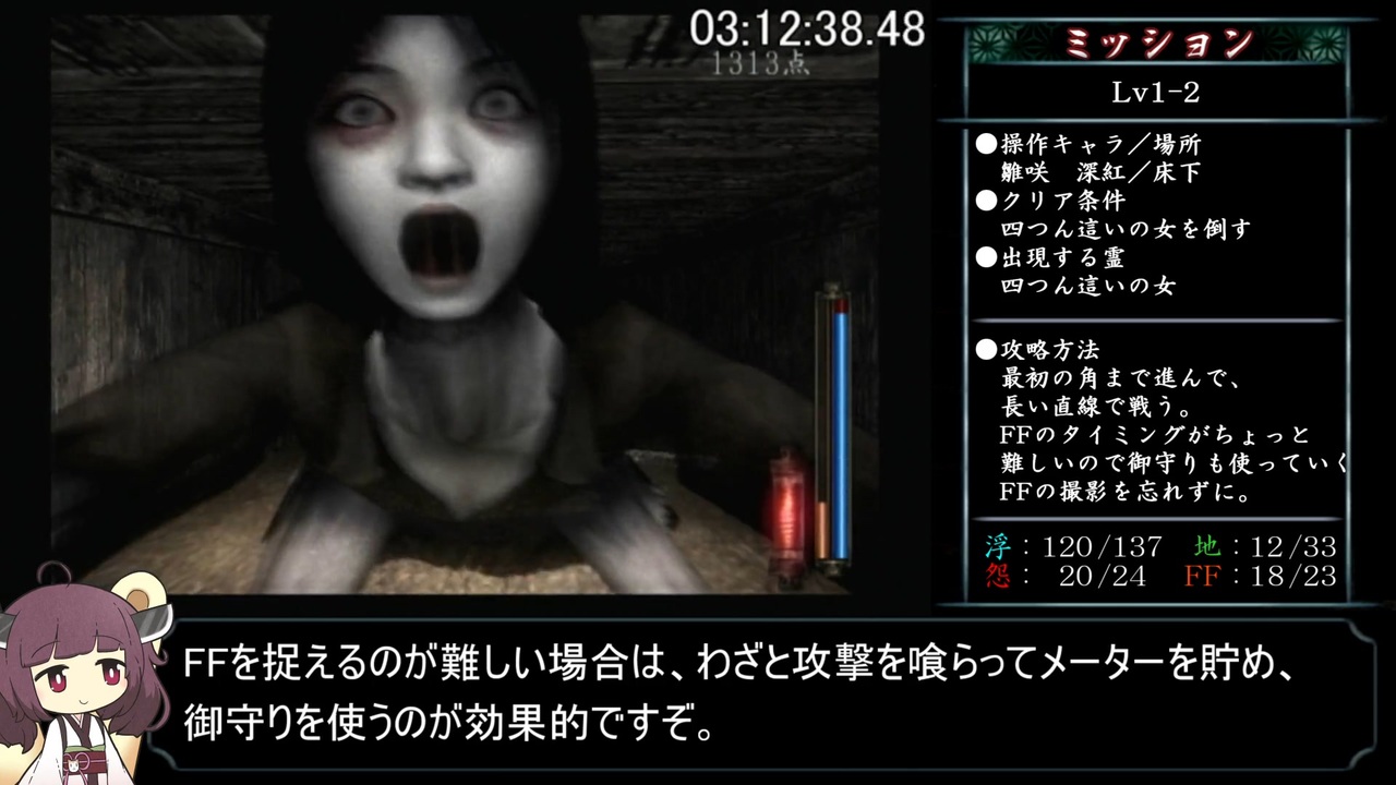 折り返し地点です。<br>2周目の編集どうすっかな~俺もな~(倍速の嵐)<br><br>終ノ刻開始~2周目開始まで<br><br><a href="https://www.nicovideo.jp/watch/sm39638169" class="watch">sm39638169</a>←前|<a href="https://www.nicovideo.jp/mylist/71775161" target="_blank" rel="noopener">mylist/71775161</a>|次→<a href="https://www.nicovideo.jp/watch/sm39737787" class="watch">sm39737787</a><br><br>RTA part1集 <a href="https://www.nicovideo.jp/mylist/71936684" target="_blank" rel="noopener">mylist/71936684</a><br><br><strong><u>▼参考サイト様等</u></strong><br>・攻略フルーツ - 零 刺青の聲 - <a href="https://xn--cool-kk4csd1lrc8dvi.xyz/zero-koe/" target="_blank" rel="noopener nofollow">https://xn--cool-kk4csd1lrc8dvi.xyz/zero-koe/</a><br>・零~刺青ノ聲~ 公式完全攻略本 導魂之書 - 株式会社エンターブレイン<br><br><strong><u>▼お借りした素材達</u></strong><br>・【akihiyo様】:立ち東北きりたん素材 - <a href="https://seiga.nicovideo.jp/seiga/im10601764" target="_blank" rel="noopener">im10601764</a><br>・【公式様】:東北ずん子のイラスト/3Dデータ - <a href="https://zunko.jp/con_illust.html" target="_blank" rel="noopener nofollow">https://zunko.jp/con_illust.html</a><br><br><strong><u>▼プレイ環境</u></strong><br>・本体(実機):SCPH-30000<br>・コントローラ:SCPH-10010<br>・ディスク:廉価版のやつ<br><br><strong><u>▼レギュレーション/縛り等</u></strong><br>・計測開始:1周目開始時New GameからNormalを選択した瞬間<br>・計測終了:2周目終了時リザルト画面にて「霊リスト:217/217」が表示された瞬間<br>・難易度は2周ともNormal<br>・エンディングは2周ともノーマルエンド<br>・バグ技はなんでもあり