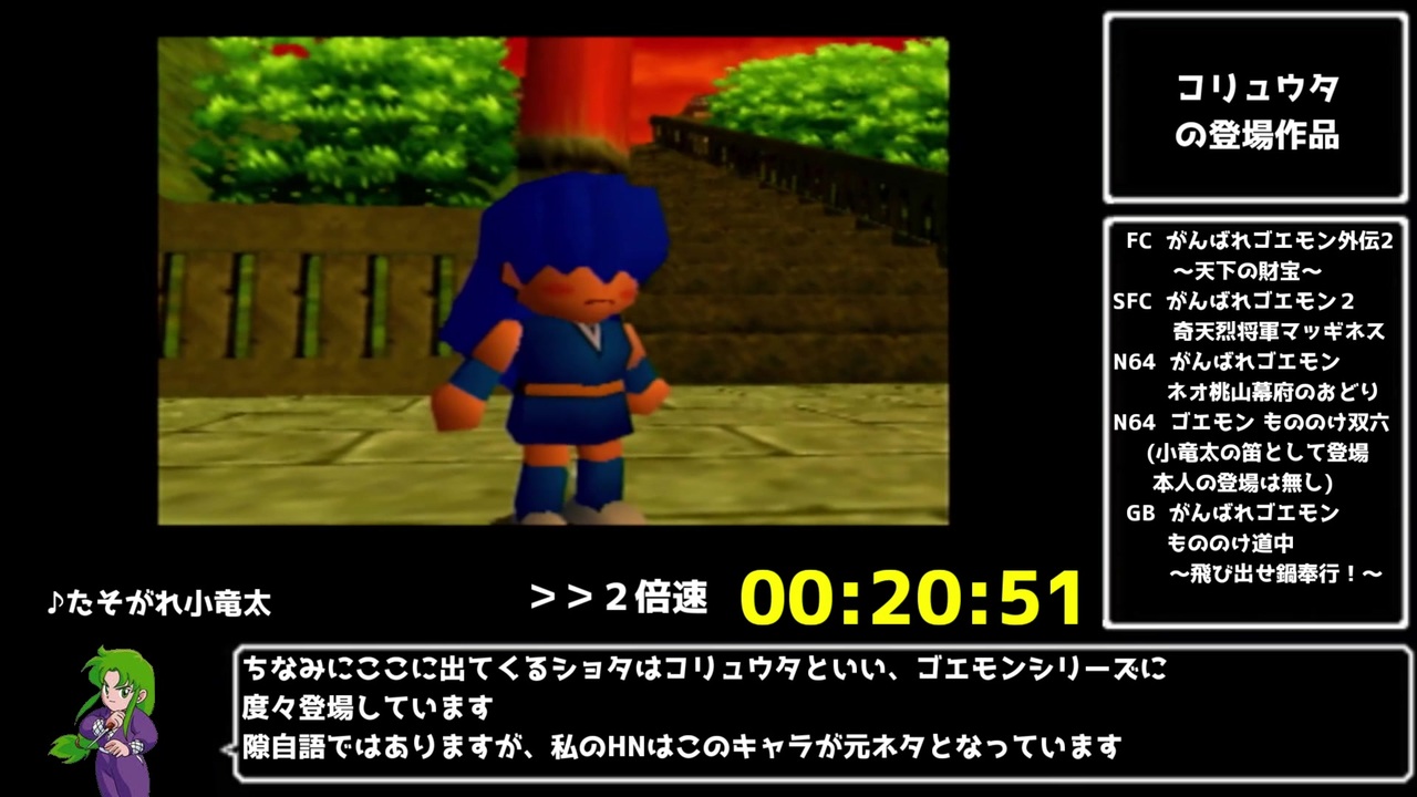 前⇒<a href="https://www.nicovideo.jp/watch/sm39627108" class="watch">sm39627108</a><br>次⇒<a href="https://www.nicovideo.jp/watch/sm39854033" class="watch">sm39854033</a><br>マイリスト⇒<a href="https://www.nicovideo.jp/mylist/72170340" target="_blank" rel="noopener">mylist/72170340</a><br><br>前回の動画でゆっくり音声が小さいとの意見をいただいたので少しゆっくり音声を上げてみました!<br>これで聞きやすくなっているといいのですが...<br><br>大江戸城攻略後~炎の小判取得まで<br>今回はもっこりスラッシュの派生技である「弁慶スキップ」が登場します!<br>技が決まるのは一瞬ではありますが、RTAらしさがあって見ごたえのある内容となっていると思います!<br><br>動画内で紹介している「弁慶スキップの解説動画」は以下のリンクを貼りますので興味がありましたら是非ご覧ください!<br>ニコニコ⇒<a href="https://www.nicovideo.jp/watch/sm39214759" class="watch">sm39214759</a><br>youtube⇒<a href="https://youtu.be/JN9mnjtJ2gk" target="_blank" rel="noopener nofollow">https://youtu.be/JN9mnjtJ2gk</a><br><br>計測開始:ゲームをリセットした瞬間<br>計測終了:ラスボスのド・エトワールを撃破し画面がホワイトアウトした瞬間<br><br>普段はTwitch( <a href="https://www.twitch.tv/koryuta_dayo" target="_blank" rel="noopener nofollow">https://www.twitch.tv/koryuta_dayo</a> )にてRTA配信をやっています<br>この動画をきっかけに、普段のRTA配信にも興味を持っていただけたら幸いです<br>