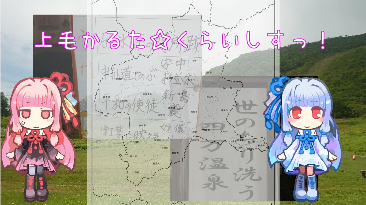 <span style="color: #ff00ff; font-size: 24px;">群馬!群馬!上毛かるた☆</span><br><br>ネタ曲投稿祭応募作品です。<br><br><br><br>群馬いい場所一度はおいで!!<br>前回のネタ曲『萱島です♪』(<a href="https://www.nicovideo.jp/watch/sm38295346" class="watch">sm38295346</a>)も見ていただけたら嬉しいな!!<br>マイリスです→<a href="https://www.nicovideo.jp/mylist/37694389" target="_blank" rel="noopener">mylist/37694389</a><br>動画のための取材楽しかったんじゃあああ!!!<br>(お金も諭吉が10枚以上飛んだけど・・・)<br><br>使用ソフト:VOICEROID:琴葉茜・葵<br> VOCALOID:初音ミク<br> NEUTRINO:きりたん・謡子・ナクモ・東北イタコ・JSUT<br><br>※1この曲に出てきた地名を貶す意図は全くありません<br><br>※2僕は香川県生まれ大阪府育ちで、群馬に住んだことは一切ありませんので、細かいミスなどあっても目を瞑っていただけると幸いです。<br><br>※3 ラスサビ、歌からして歌詞間違えています・・・しのぶ毛の国に引っ張られました(言い訳)<br>〇「昔を語る多胡の古碑」<br>×「昔をしのぶ多胡の古碑」
