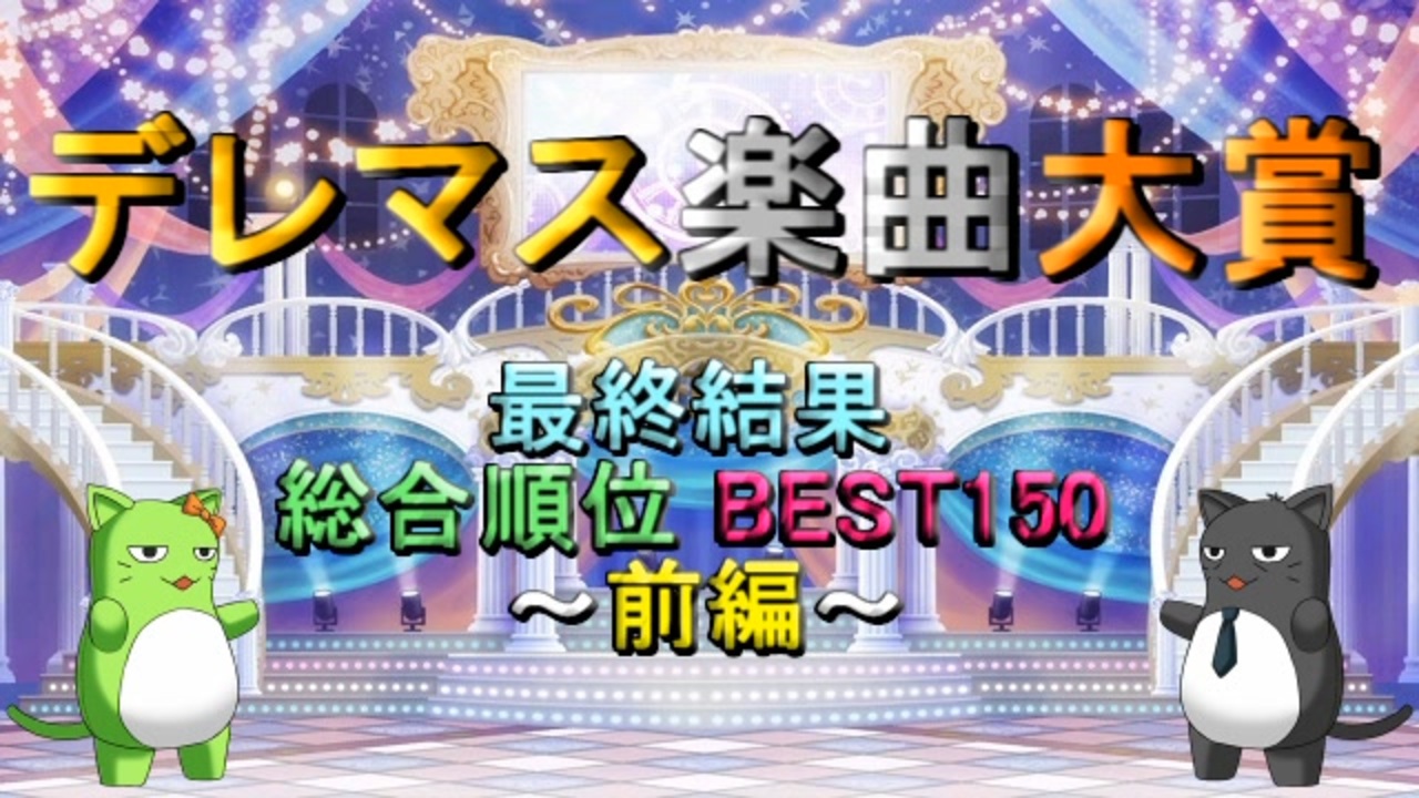 <span style="font-size: 24px;"><strong><i>未来を照らして進め</i></strong></span><span style="color: #ff00ff; font-size: 24px;"><strong><i>!</i></strong></span><span style="color: #00ffff; font-size: 24px;"><strong><i>!</i></strong></span><span style="color: #ff9900; font-size: 24px;"><strong><i>!</i></strong></span><span style="color: #00ff00; font-size: 24px;"><strong><i>!</i></strong></span><br><br>2021年9月3日から10月15日まで開催していた<span style="color: #ff0000;"><strong>『デレマス楽曲大賞』</strong></span>の最終結果<br>(総合順位)前編です。<span style="color: #0000ff;"><strong>参加者1951名</strong></span>の回答を集計し、<span style="color: #00ff00;"><strong>合計pt上位の150曲</strong></span>を<br>ご紹介します(<span style="color: #9900ff;"><strong>前編では150位~51位</strong></span>までを発表)。<br><br><strong><i>429曲の先頭に立って、まだ見ぬ次の世界に向かって走りだした楽曲は果たして...?!</i></strong><br><br>☆最終結果(総合順位・後編):<a href="https://www.nicovideo.jp/watch/sm39689585" class="watch">sm39689585</a><br>☆最終結果(P属性別・前編):<a href="https://www.nicovideo.jp/watch/sm39689633" class="watch">sm39689633</a><br>☆最終結果(P属性別・後編):<a href="https://www.nicovideo.jp/watch/sm39689685" class="watch">sm39689685</a><br><br>●『アイマス楽曲ランキングシリーズ』:<a href="https://www.nicovideo.jp/mylist/57911966" target="_blank" rel="noopener">mylist/57911966</a><br>●『THE IDOLM@STER Song Collection』:<a href="https://www.nicovideo.jp/mylist/61493969" target="_blank" rel="noopener">mylist/61493969</a>