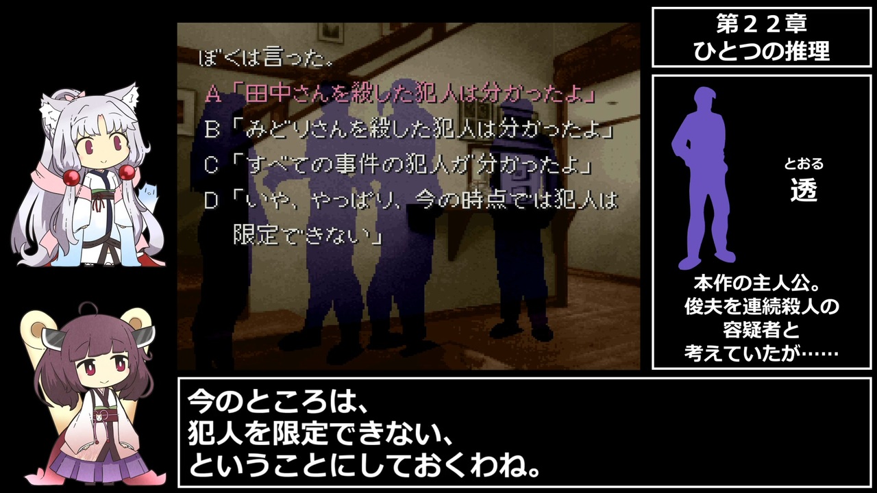明日になったらさ、全部お芝居だったんだよって……。<br>このペンションの余興なんだよって……。<br><br>part1 <a href="https://www.nicovideo.jp/watch/sm39676831" class="watch">sm39676831</a><br>part3 <a href="https://www.nicovideo.jp/watch/sm39702173" class="watch">sm39702173</a><br><br /><br>YouTubeにも投稿してます<br><a href="https://www.youtube.com/@chamame_t" target="_blank" rel="noopener nofollow">https://www.youtube.com/@chamame_t</a><br><br>ツイッター始めました<br><a href="https://twitter.com/chamame_t" target="_blank" rel="noopener nofollow">https://twitter.com/chamame_t</a><br><br>RTA part1リンク<br><a href="https://www.nicovideo.jp/mylist/73242230" target="_blank" rel="noopener">mylist/73242230</a><br>東北姉妹とレトロゲーム part1リンク<br><a href="https://www.nicovideo.jp/mylist/73242072" target="_blank" rel="noopener">mylist/73242072</a>