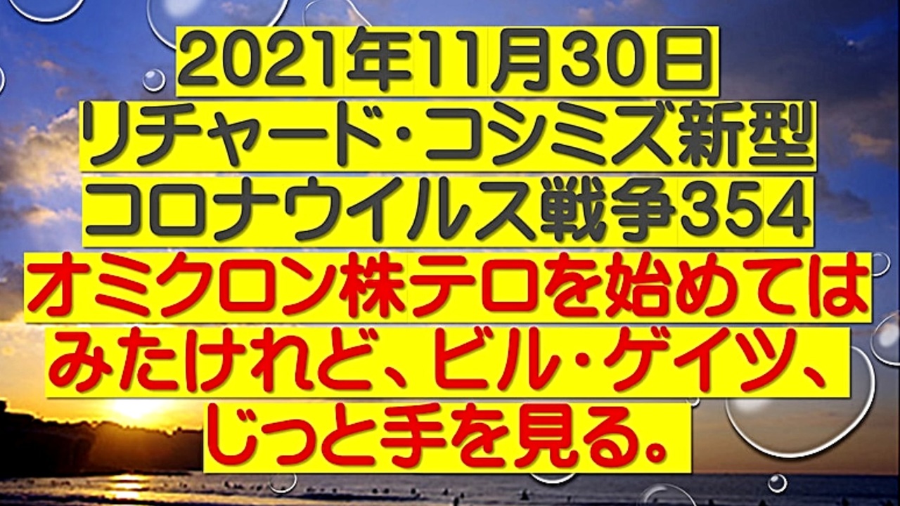 <span style="color: #cc4125;"><strong>「 テーマ:新型コロナウイルス戦争 354 」</strong></span><br><br><span style="color: #ff0000;"><strong>「『 オミクロン株テロ 』を始めてはみたけれど、ビル・ゲイツ、じっと手を見る 」</strong></span><br><br> ◆新型コロナテロのスケジュールが、DEEP STATE裏社会の思惑通りに進んでいないため、<br> オミクロン・パンデミックを計画前倒しで、人口削減ほぼ無傷の南アフリカから投入した。<br> そして、世界中に拡大させる予定である。<br><br> ◆日本は、イベルメクチンの効果により、新型コロナウイルスはほとんど存在していない。<br><br> ◆南アフリカ医師会<br> 「 オミクロンは軽症で、1,2日、筋肉痛や倦怠感がある。今のところ、嗅覚や味覚を失った人<br> はいない。少し咳が出る。自宅療養の人もいる。病院はパンクしていない。発見から2週間し<br> た経っておらず調査中なのに、なぜ世界中で過剰反応しているのか分からない 」<br><br> ◆「 厚生労働省発表(2021年11月12日): 日本のコロナワクチン接種後の状況 1359人死亡 」は、<br> 真っ赤なウソである。ワクチン接種後の本当の死亡者数は、約50,000人である。<br><br><span style="color: #38761d;">◆</span><span style="color: #38761d;"><strong>リチャード・コシミズ 公式 ブログ</strong></span><br> <a href="https://ameblo.jp/richardneversurrender/" target="_blank" rel="noopener nofollow">https://ameblo.jp/richardneversurrender/</a><br><br><span style="color: #38761d;">◆</span><span style="color: #38761d;"><strong>リチャード・コシミズ 公式 ホームページ</strong></span><br> <a href="http://richardkoshimizu.boo.jp/" target="_blank" rel="noopener nofollow">http://richardkoshimizu.boo.jp/</a><br><br><span style="color: #38761d;">◆</span><span style="color: #38761d;"><strong>リチャード・コシミズ 講演会 公式 動画ギャラリー</strong></span><br> <a href="http://www.t-sskk.com/richardkoshimizu/video-gallery/index.html" target="_blank" rel="noopener nofollow">http://www.t-sskk.com/richardkoshimizu/video-gallery/index.html</a><br>