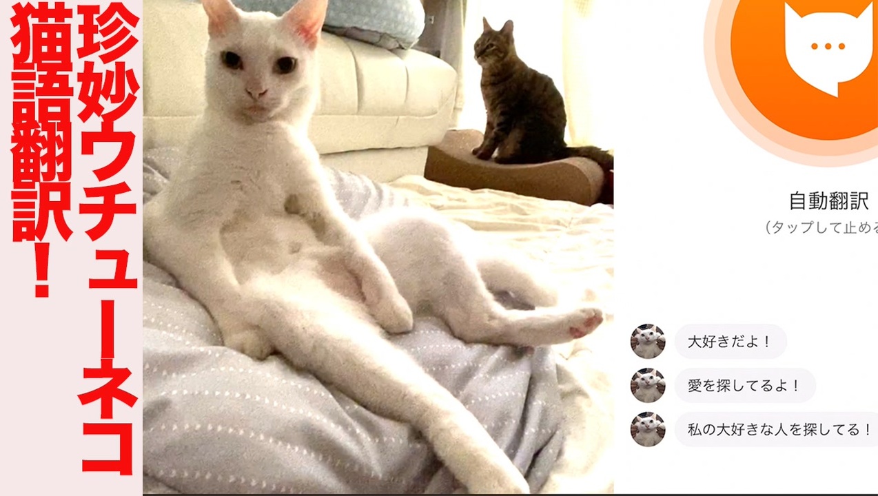 猫語翻訳アプリの「にゃんトーク」で我が家の猫たち検証第4弾。<br>前回の猫型珍獣・曉璘、鳴き声のクセがすごい美少年オス三毛猫・翡文、元武闘派ボス猫・チャー坊に続き、一家の主猫にしてウチューネコチャン・麿白先生で検証をおこなってみました。果たしてウチューネコ語は翻訳できるのか!?<br>別画面で録画のため多少ラグはありますが、だいたい鳴き声と翻訳のタイミングは合ってると思います。<br><br>簡単な登場猫紹介 <a href="http://blog.livedoor.jp/nekokamasu/archives/56241249.html" target="_blank" rel="noopener nofollow">http://blog.livedoor.jp/nekokamasu/archives/56241249.html</a><br>よくあるご質問 <a href="http://blog.livedoor.jp/nekokamasu/archives/57126148.html" target="_blank" rel="noopener nofollow">http://blog.livedoor.jp/nekokamasu/archives/57126148.html</a><br>ブログ <a href="http://blog.livedoor.jp/nekokamasu/" target="_blank" rel="noopener nofollow">http://blog.livedoor.jp/nekokamasu/</a><br><br>