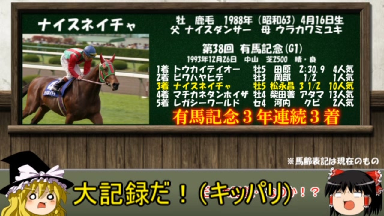 前作<a href="https://www.nicovideo.jp/watch/sm39560877" class="watch">sm39560877</a> 次作<a href="https://www.nicovideo.jp/watch/sm39849018" class="watch">sm39849018</a> 牝馬シリーズマイリス<a href="https://www.nicovideo.jp/mylist/65869255" target="_blank" rel="noopener">mylist/65869255</a> 競馬解説マイリス<a href="https://www.nicovideo.jp/mylist/64207040" target="_blank" rel="noopener">mylist/64207040</a> <br><br>つべ<a href="https://youtu.be/wpUDKqi-r-o" target="_blank" rel="noopener nofollow">https://youtu.be/wpUDKqi-r-o</a><br><br>名馬解説第14弾、ナイスネイチャです。<br>前人未到の大記録を達成した偉大なブロンズコレクター!<br>是非とも長生きして欲しいものです…。<br><br>BGM:甘茶の音楽工房様<br>画像提供元: TURF☆DUST 様 うまぽっと様 いらすとや様 きつねゆっくり様<br>参考HP:優駿達の蹄跡様 netkeiba.com Wikipedia JRA JBISサーチ ニコニコ大百科(仮)