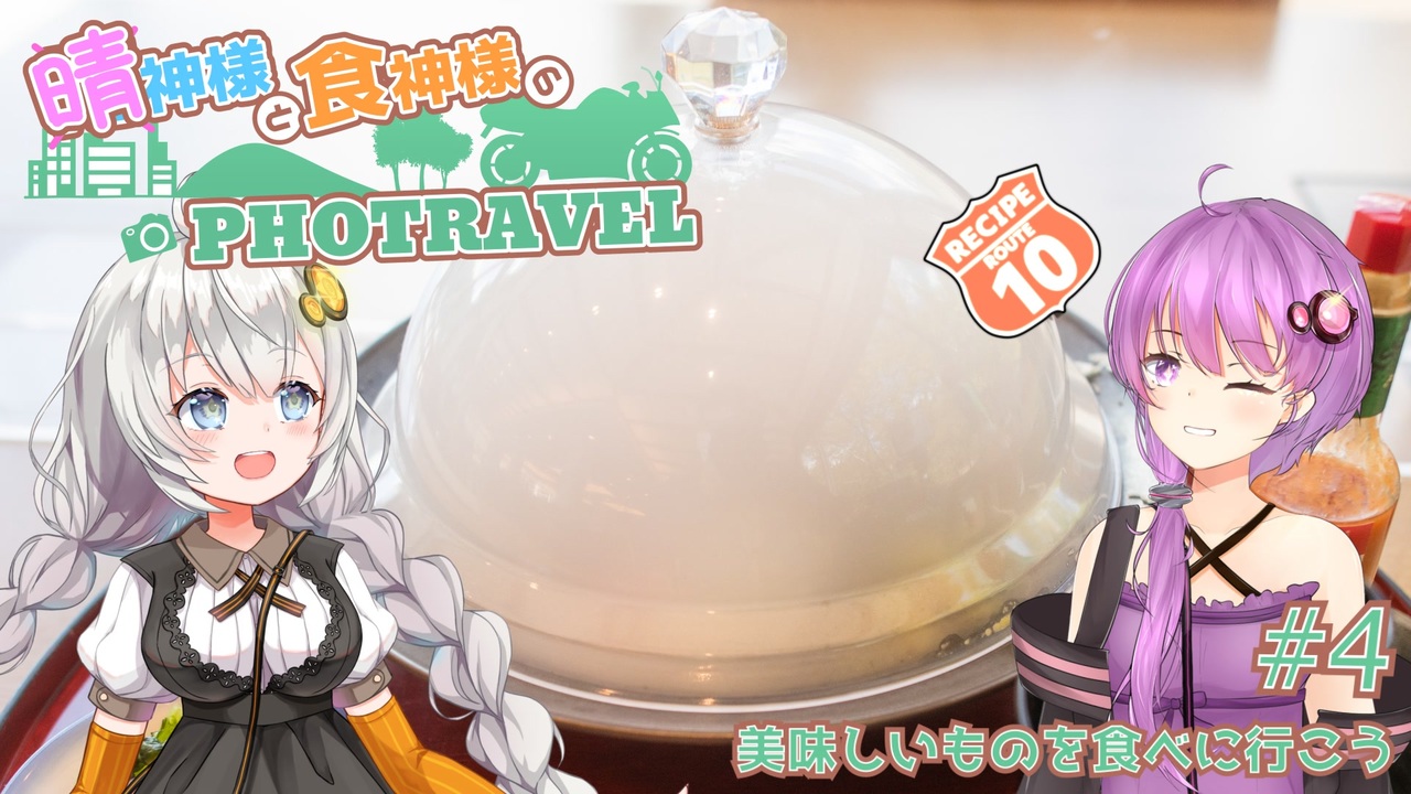 まさかのコラボ企画にお誘い受けてしまいました!!<br>食レポ車載動画というよりは結局いつもの写真旅動画ですが<br>良ければお付き合い頂けると幸いです。<br><br>それよりなにより相方のりょの字さん、色々とすみません。。<br><br><br><span style="color: #ff0000;"><strong>【追記②レシピルート10裏話】<br>akuzus側①:<a href="https://akuzus.fanbox.cc/posts/3098475" target="_blank" rel="noopener nofollow">https://akuzus.fanbox.cc/posts/3098475</a><br>りょの字さん側:<a href="https://ryonoji2021.fanbox.cc/posts/3114362" target="_blank" rel="noopener nofollow">https://ryonoji2021.fanbox.cc/posts/3114362</a></strong></span><br><br><br><u>よくありそうな質問</u><br>Q1:なんで食材名まで縛ったんですか?<br>A1:初期の相談時に話していたのがそのまま頭に残ってましたねー。。<br><br>Q2:コラボ動画なのにどうして番外編にしてないんですか?<br> <span style="font-size: 10px;"><s>これを本編にすればまた4か月くらい投稿無くてもいいかなって。</s></span><br>A2:5分以上私たちを動かすのはメインのシリーズだけって決めているのです。<br><br>Q3:全然食べ足りないんですけど…<br>A3:りょの字さんに美味しいものを作ってもらいに行きましょう。<br><br><br><span style="color: #ff9900; font-size: 24px;">相方のりょの字さん側の動画 → (<a href="https://www.nicovideo.jp/watch/sm39706763" class="watch">sm39706763</a>)</span><br>りょの字さんマイページ → (<a href="https://www.nicovideo.jp/user/89340736" target="_blank" rel="noopener">user/89340736</a>)<br><br>レシピルート10マイリスト → (<a href="https://www.nicovideo.jp/mylist/72217457" target="_blank" rel="noopener">mylist/72217457</a>)<br><br> <br>【本企画でのトークソフト音声の用途について】<br>本企画ではさわらさんが事前に各メーカさんに対し本企画用の許諾得てくださいました。さすさわ<br><br><br>(<a href="https://www.nicovideo.jp/watch/sm39123798" class="watch">sm39123798</a>) ←【前回(#3)】【次回】→ PCトラブルにより二人とも消えてしまいました。。<br><br>【晴神様と食神様のPhotravel】 (<a href="https://www.nicovideo.jp/series/221134" target="_blank" rel="noopener">series/221134</a>)<br><br>(他のシリーズ)<br>【晴神様のお写ん歩Diary】(<a href="https://www.nicovideo.jp/series/255415" target="_blank" rel="noopener">series/255415</a>)<br><br>【食神様のおうちごはん】(<a href="https://www.nicovideo.jp/series/247964" target="_blank" rel="noopener">series/247964</a>)<br><br>【ゆかりさん・あかりちゃんと どきどきバイク旅】(<a href="https://www.nicovideo.jp/mylist/66406450" target="_blank" rel="noopener">mylist/66406450</a>)<br>
