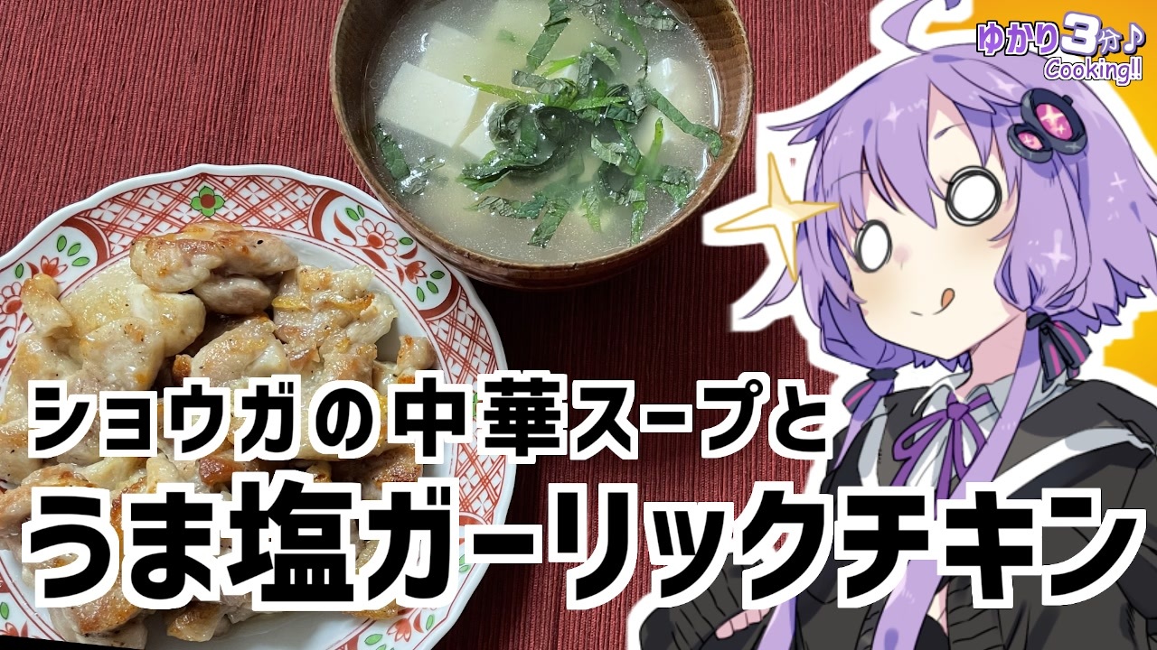 結月ゆかりを使用した料理動画です<br><br>うま塩ガーリックチキンとショウガの中華スープ作りました!<br>寒い日はショウガが染みますねえ<br><br>ガラナを飲んだ後私の身に起こった事は『いいね!』ボタンを押して確認してくれよな!<br><br>今回使用した材料<br>鶏もも肉:250g 片栗粉:大さじ1<br>酒:大さじ1 ごま油:大さじ1/2<br>味覇:小さじ1/2 砂糖:小さじ1/2<br>ニンニク:1欠 塩コショウ:少々<br><br>前回のエビとバジルの欧風チャーハン:<a href="https://www.nicovideo.jp/watch/sm39697439" class="watch">sm39697439</a><br>VOICEROID劇場 新訳猫町:<a href="https://www.nicovideo.jp/watch/sm39506126" class="watch">sm39506126</a><br>やっと完結したJK旅京都お花見編:<a href="https://www.nicovideo.jp/watch/sm39639517" class="watch">sm39639517</a><br><br>オススメのボイロ劇場<br>茜ちゃんと葵ちゃんの現代怪異占い:<a href="https://www.nicovideo.jp/watch/sm38263500" class="watch">sm38263500</a><br><br>ツイッター:<a href="https://twitter.com/mrt89244817" target="_blank" rel="noopener nofollow">https://twitter.com/mrt89244817</a>