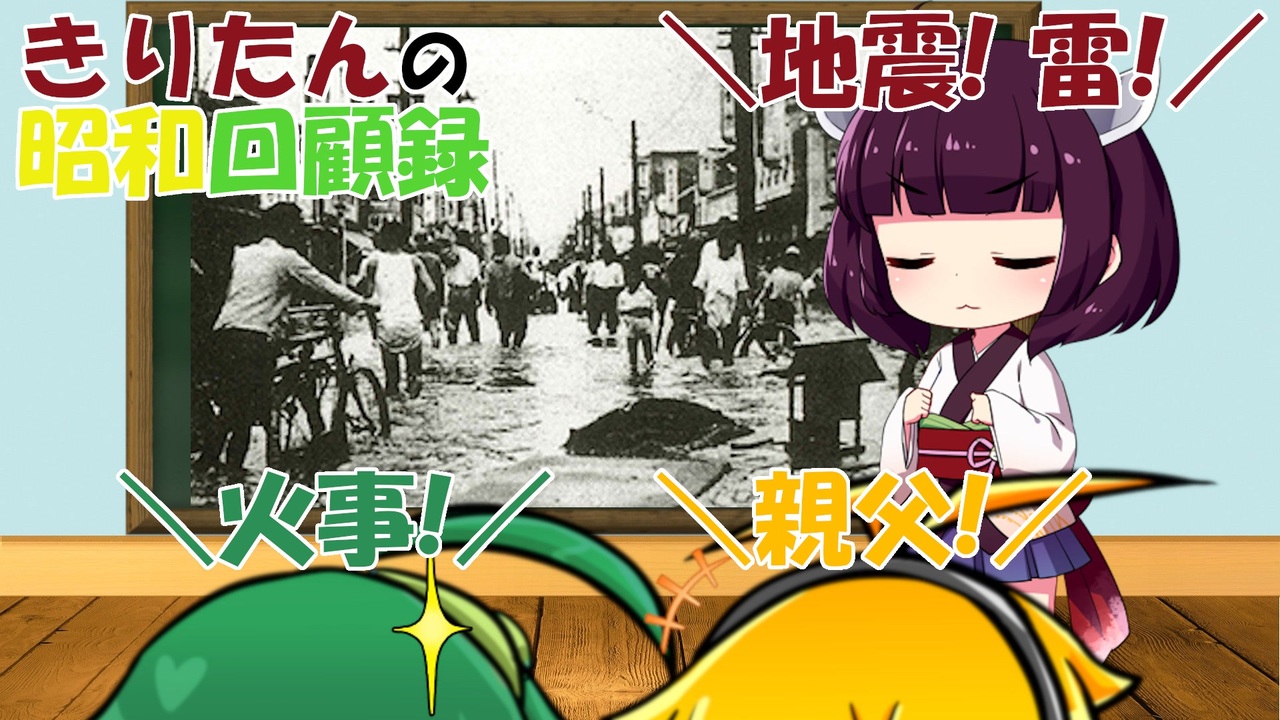 <strong>ようこそ! 昭和回顧録へ!</strong><br><br>昭和22年、到着ですよ!<br>日本は地震の多い国としても知られていますが、地震以外の自然災害も昔から悩まされてきました。<br>しかし、だからこそ育まれる強さがあるのだとも思いますね。<br><br>では、ごゆっくりとお楽しみください!<br><br><a href="https://www.nicovideo.jp/watch/sm39637650" class="watch">sm39637650</a> ← 前 次 → <a href="https://www.nicovideo.jp/watch/sm39783885" class="watch">sm39783885</a><br>回顧目録 → <a href="https://www.nicovideo.jp/mylist/70366107" target="_blank" rel="noopener">mylist/70366107</a><br>YouTube版 → <a href="https://youtu.be/1XrXPao3cHs" target="_blank" rel="noopener nofollow">https://youtu.be/1XrXPao3cHs</a><br><br>シリーズ一話マイリスト →<span style="color: #006699;"> <a href="https://www.nicovideo.jp/mylist/69322831" target="_blank" rel="noopener">mylist/69322831</a></span><br>試作品マイリスト → <a href="https://www.nicovideo.jp/mylist/69322827" target="_blank" rel="noopener">mylist/69322827</a><br><br>更新情報とか質問とかツイッター → <a href="https://twitter.com/suzakatsuki" target="_blank" rel="noopener nofollow">https://twitter.com/suzakatsuki</a> <br><br>~お借りしたもの~<br>キャスト:東北きりたん、東北ずん子、弦巻マキ<br>立ち絵:blueberry様(SD東北きりたん他)、りんどう様(ボイロミニキャラ後ろ姿素材)<br>背景:Pixabay様<br>小物類:写真AC様<br> イラストAC様<br> いらすとや様<br> パブリックドメインQ様<br> カスリーン台風70年 特集サイト様 <a href="http://www.unei-jimukyoku.jp/kathleen70/index.html" target="_blank" rel="noopener nofollow">http://www.unei-jimukyoku.jp/kathleen70/index.html</a><br> Wikimedia カスリーン台風様<br><a href="https://ja.wikipedia.org/wiki/%E3%82%AB%E3%82%B9%E3%83%AA%E3%83%BC%E3%83%B3%E5%8F%B0%E9%A2%A8" target="_blank" rel="noopener nofollow">https://ja.wikipedia.org/wiki/%E3%82%AB%E3%82%B9%E3%83%AA%E3%83%BC%E3%83%B3%E5%8F%B0%E9%A2%A8</a><br> かるび勉強部屋様 <a href="https://yuzupa.com/rivers/" target="_blank" rel="noopener nofollow">https://yuzupa.com/rivers/</a><br><br>BGM:こんとどぅふぇ HiLi様<br> OP ほいっぷ!インストゥルメンタル<br> BGM 散歩道、お昼寝まくら、メルヘンぼうけんたい、ひとりぼっちの妖精、そらのくも、江戸桜の下で、目が覚めた<br>効果音:魔王魂様<br> On-Jin ~音人~様<br><br>※リンク情報などは、マイリストの説明欄にて補足しています。